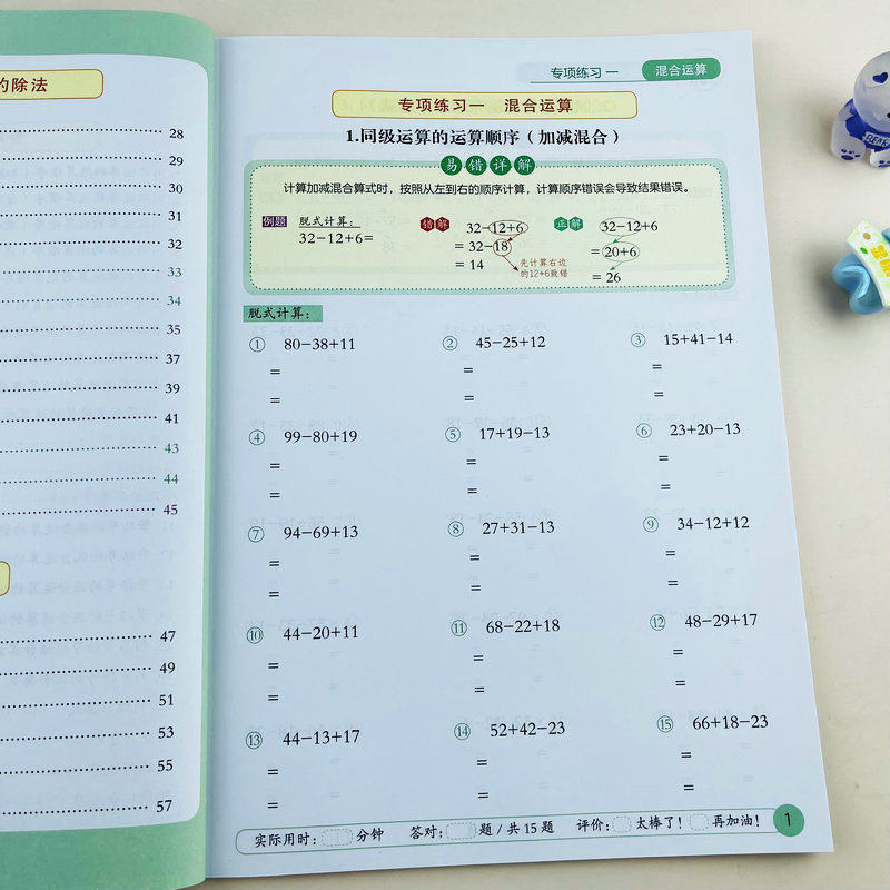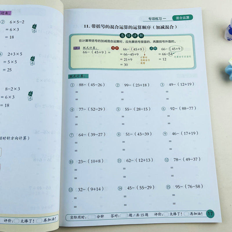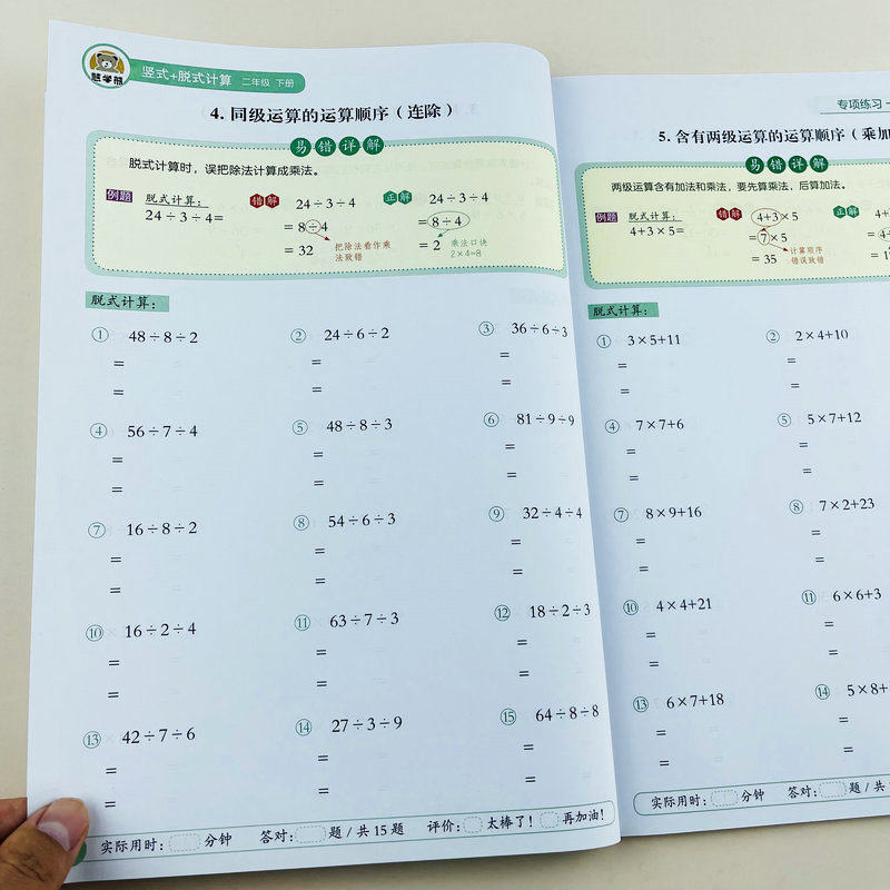 小学数学二年级下册竖式脱式计算练习册人教版同步计算题强化训练加减乘除混合运算易错题练习有余数的除法提升计算能力易错详解