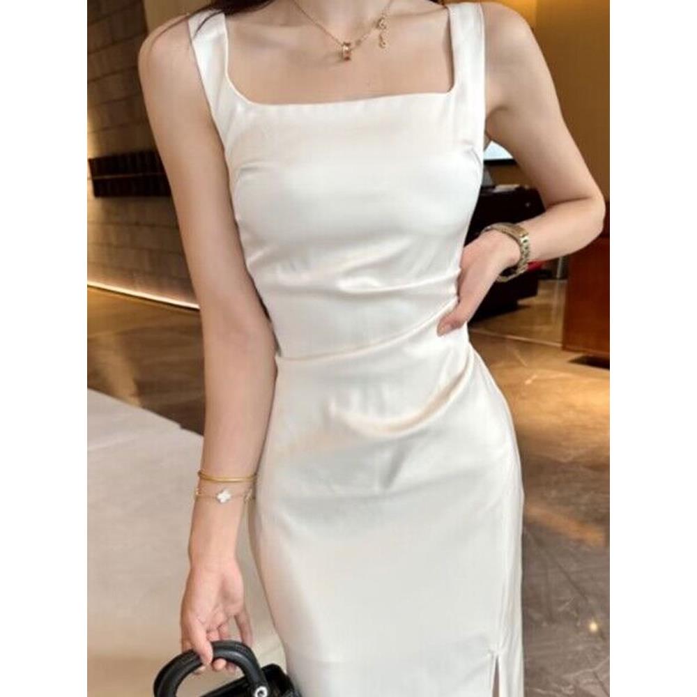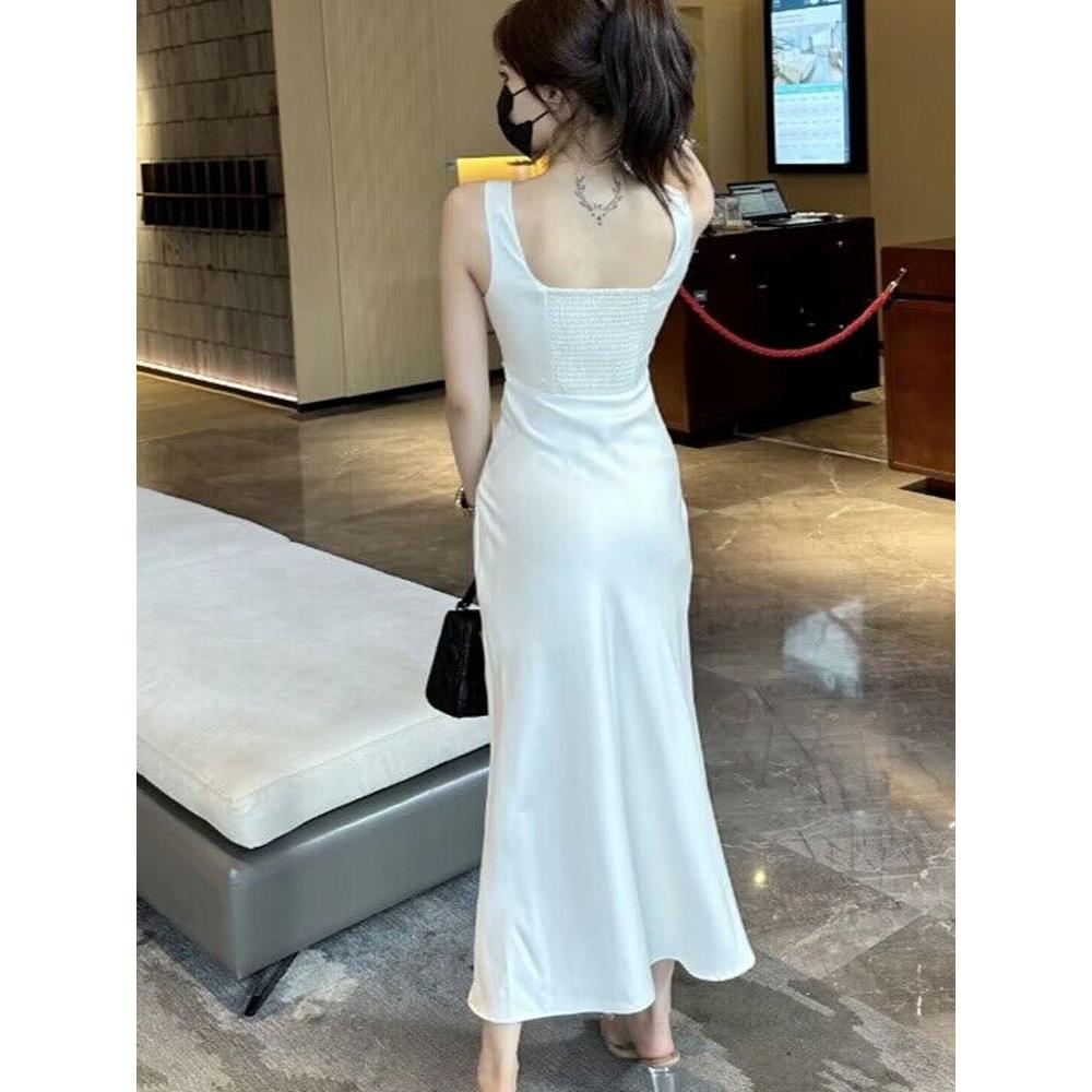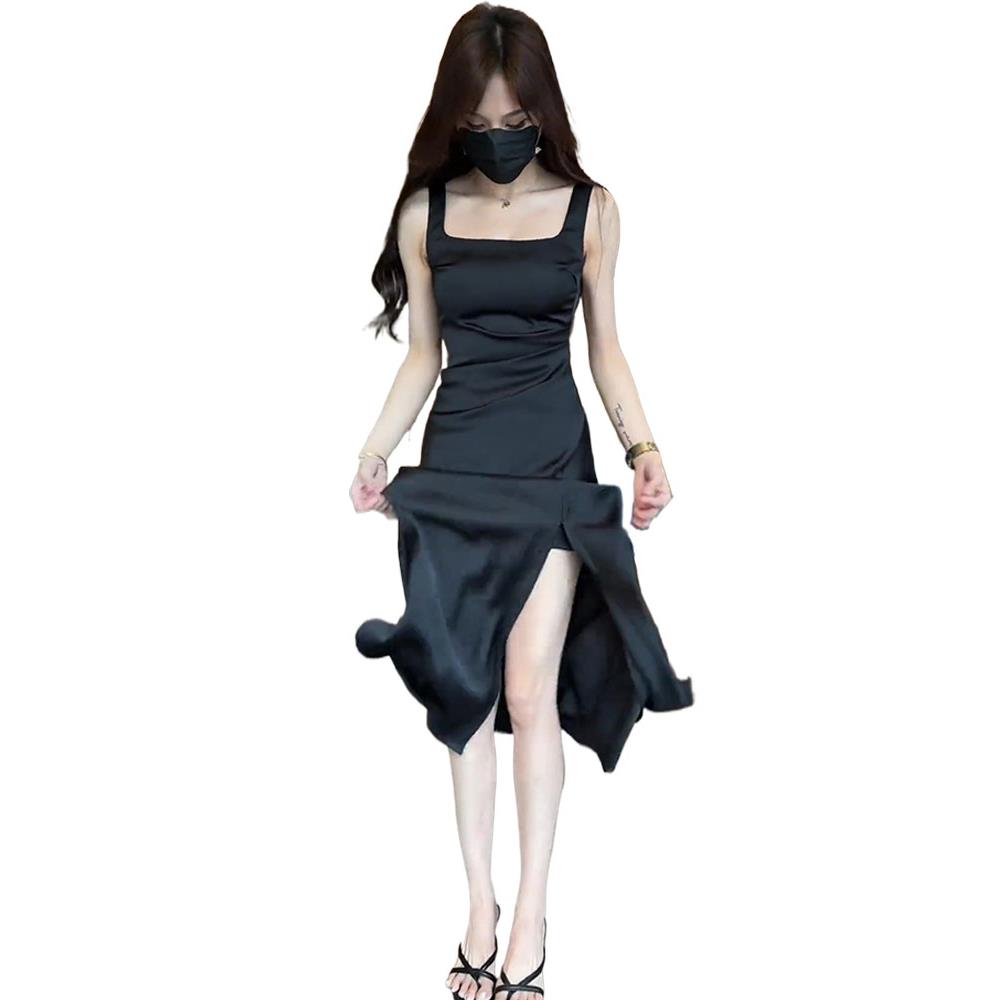 缎面高端精致连衣裙女夏季黑色赫本风吊带裙开叉显瘦包臀长裙子潮