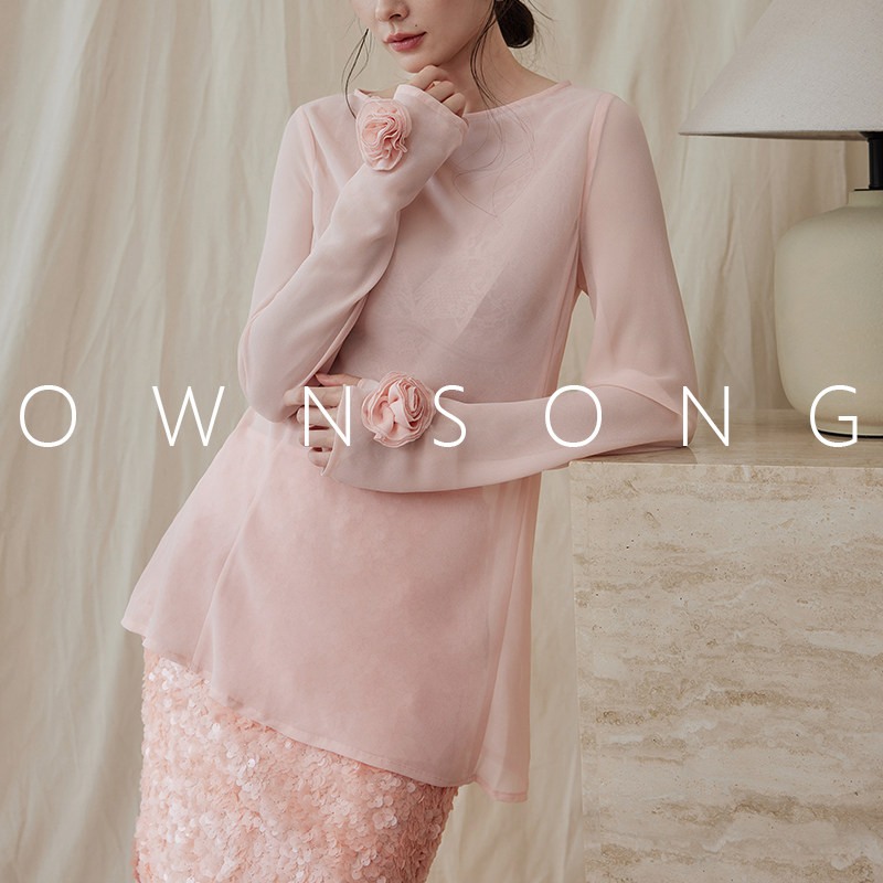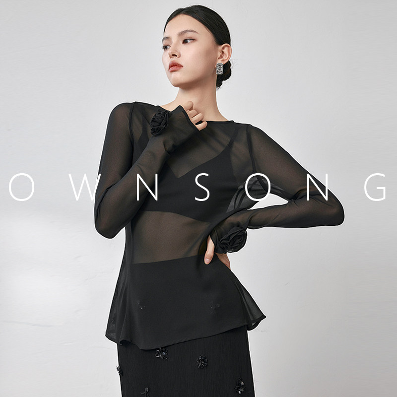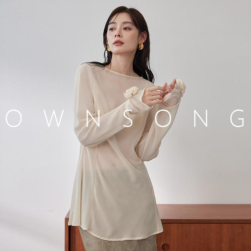 OWNSONG 通透优雅 立体手工花朵春夏薄款收腰真丝上衣套头衬衣衫