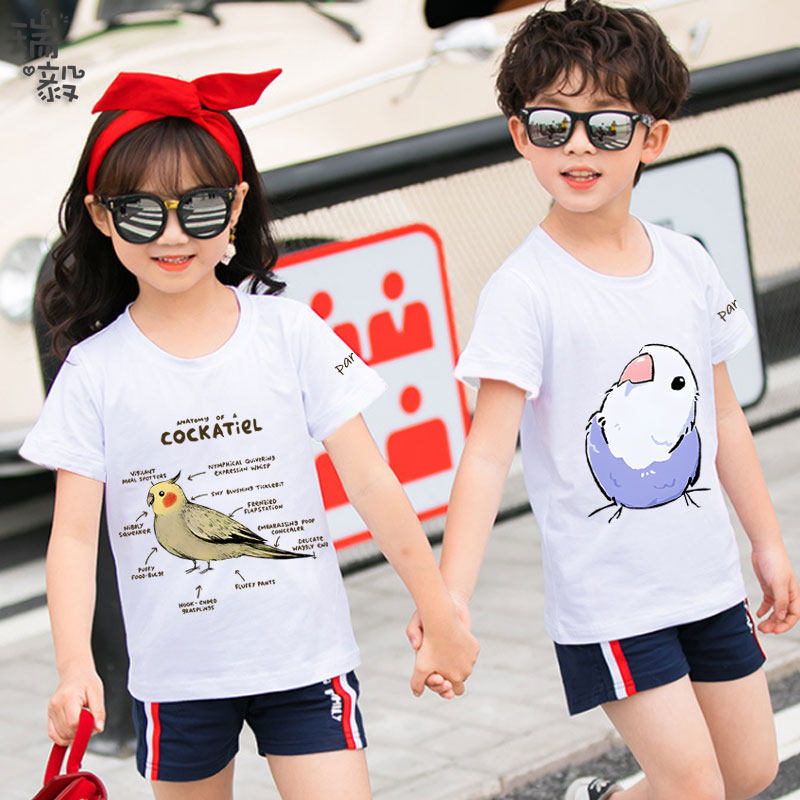 玄凤鹦鹉卡通小鸟可爱短袖T恤衫男女大中小儿童装学生宝宝款半袖