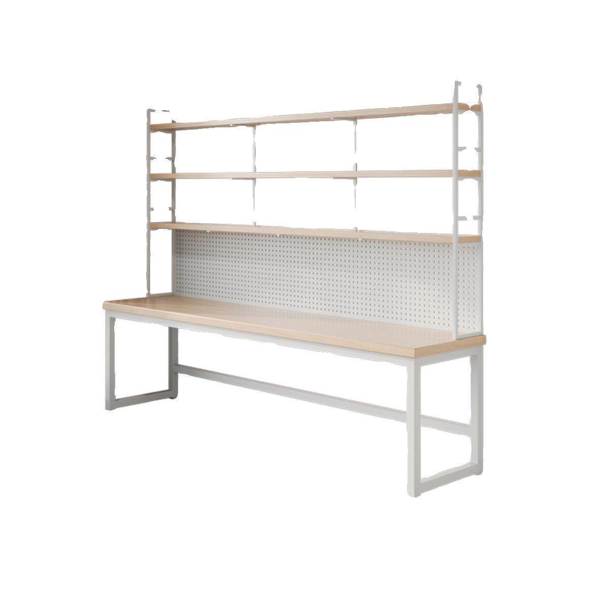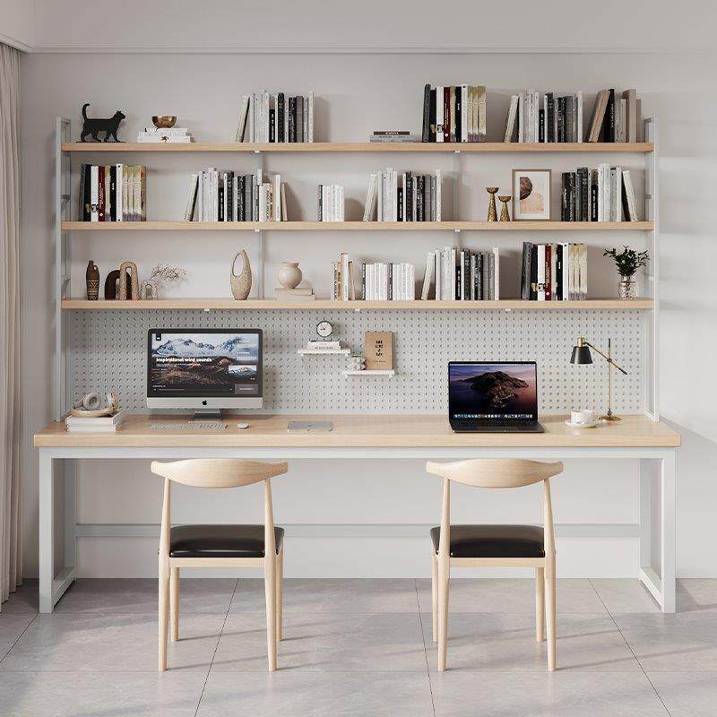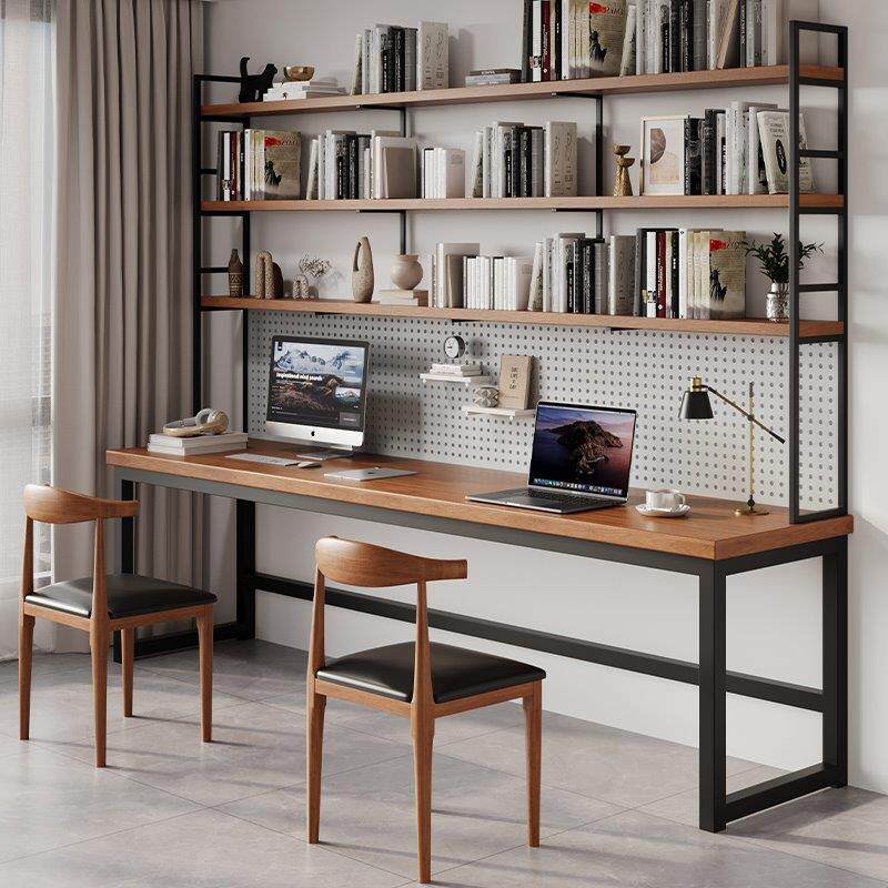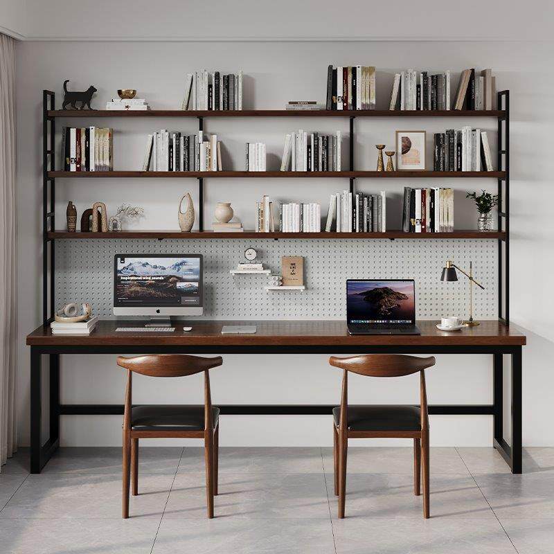 原木书桌书架一体桌家用双人写字台台式电脑桌带洞洞板收纳办