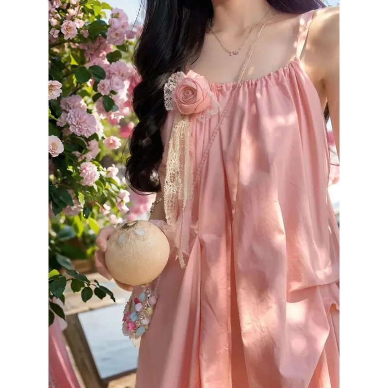 薄荷曼波风法式粉色吊带连衣裙女春夏多巴胺三亚海边度假沙滩长裙