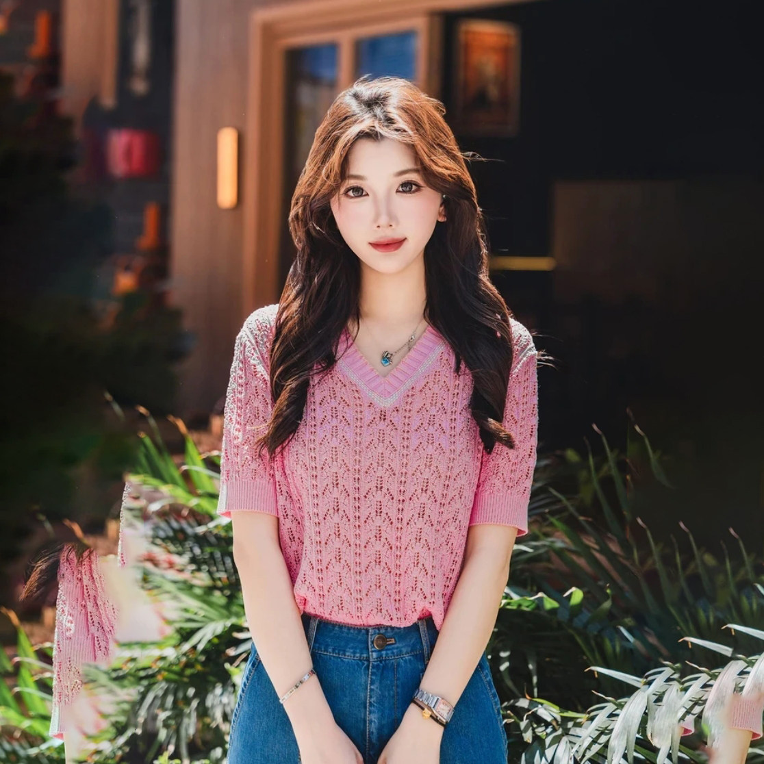 2025夏新款白领哥弟新轻职风短袖镂空时尚法式针织V领短袖138046