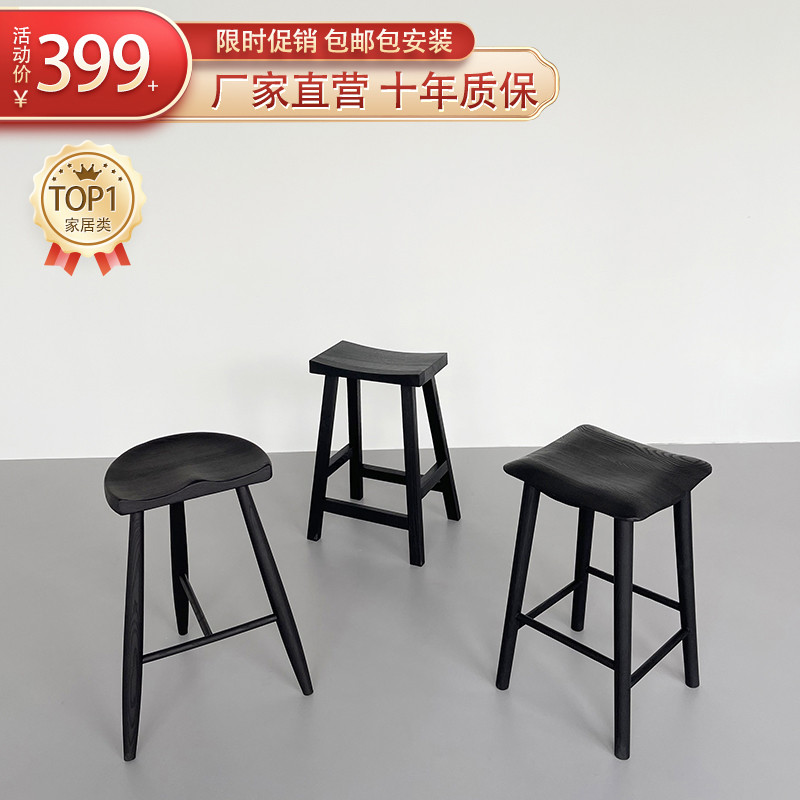 侘寂风高脚凳碳化黑色休闲椅白蜡木吧台椅家用休闲原木靠背椅