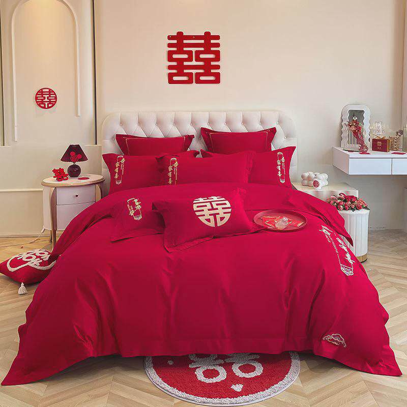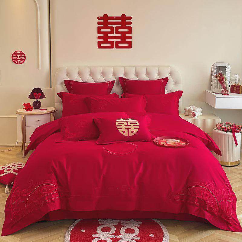高档结婚中式刺绣龙凤床上用品四件套大红色新婚陪嫁婚庆床单被套