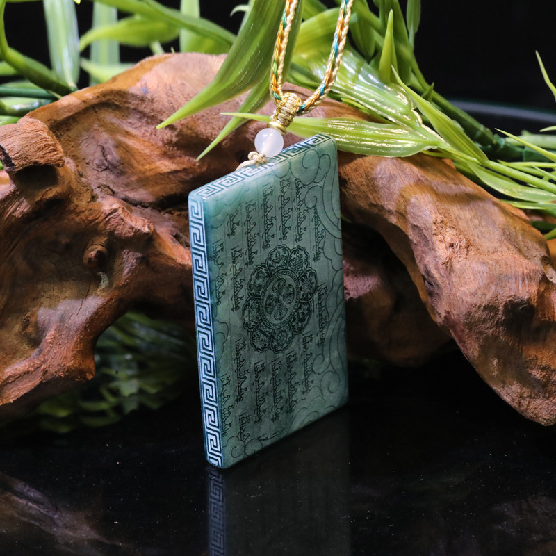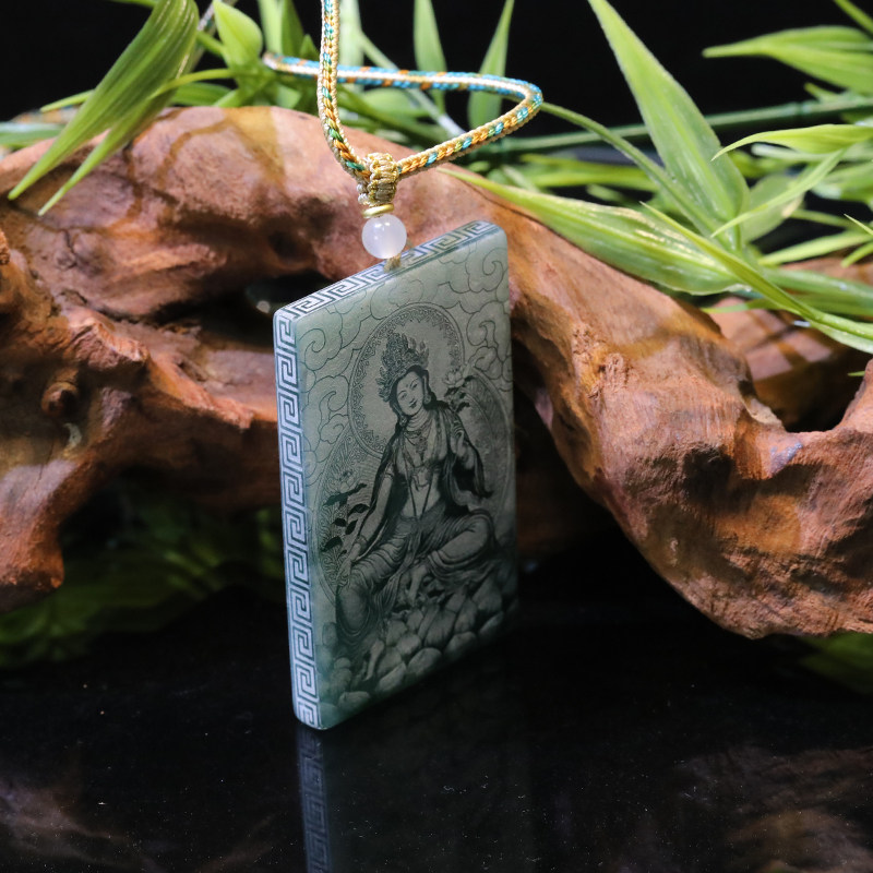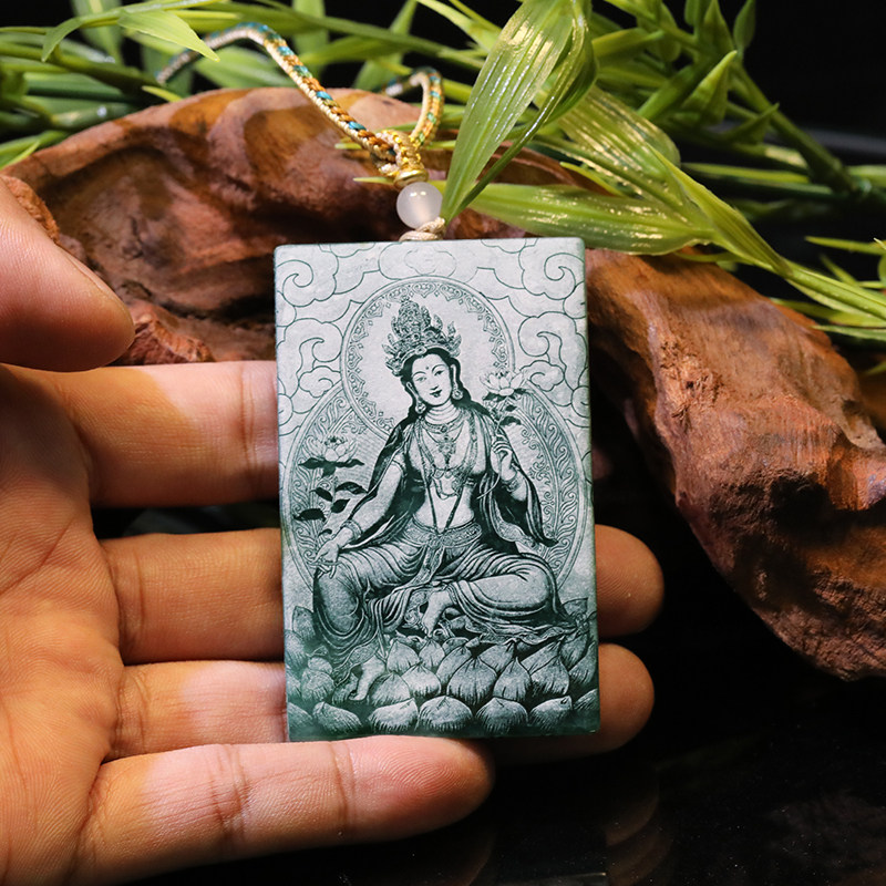 首页> 配饰> 唐今玉天然A货翡翠绿度母蓝水料双面精工影雕高冰种老玉石吊坠牌
