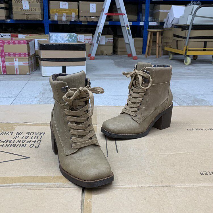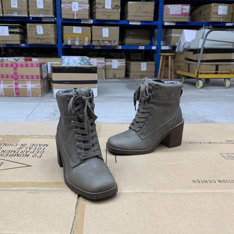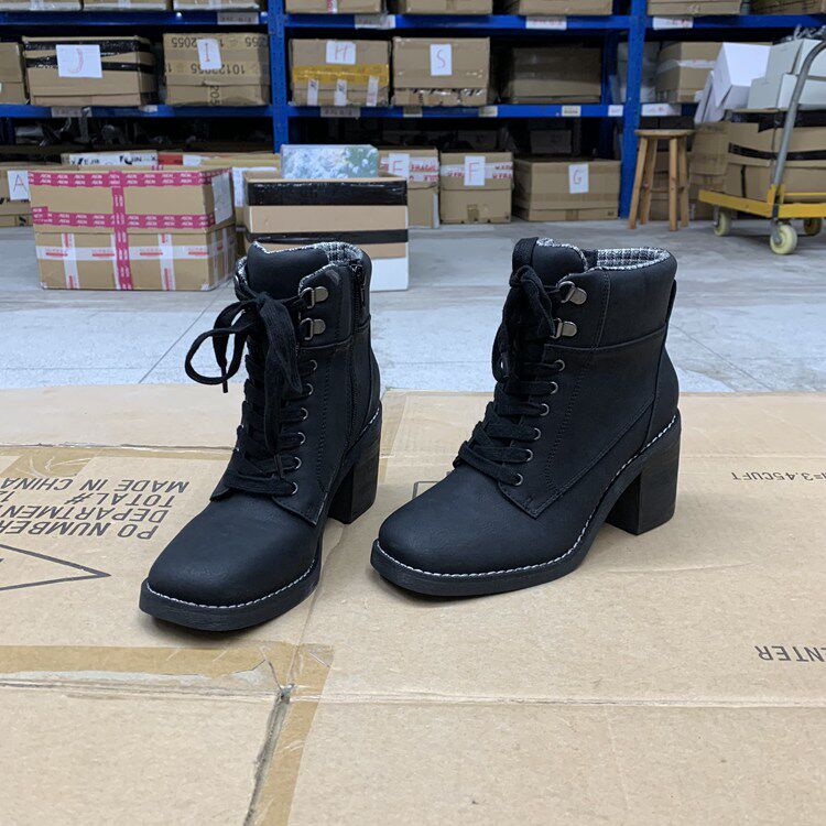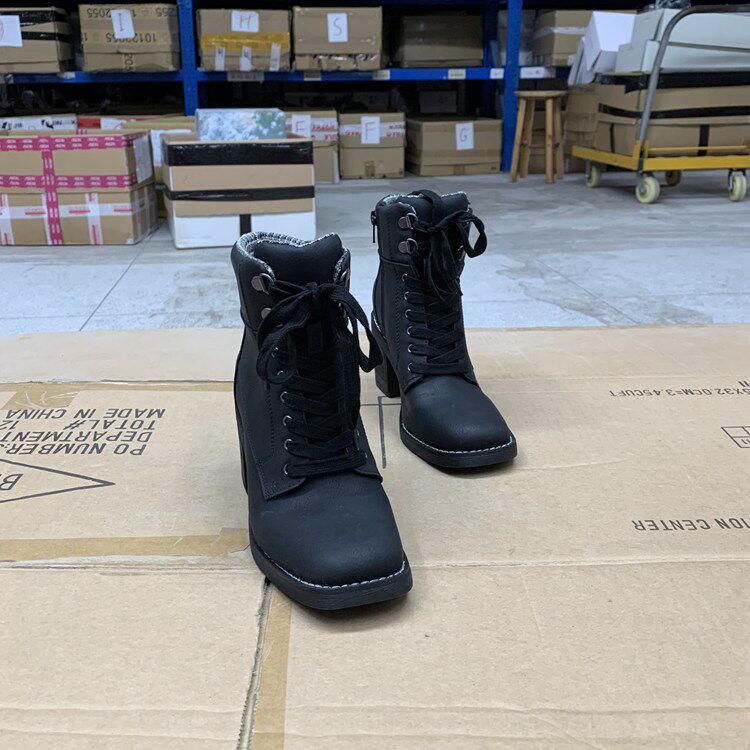 外贸原单方头时尚系带粗跟欧美冷酷时尚工装靴高跟中筒