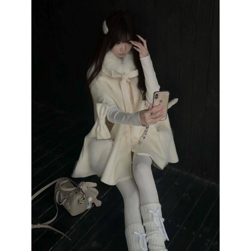 东京恋人 优雅千金风可拆卸蝴蝶结系带毛领温柔感斗篷款毛呢外套