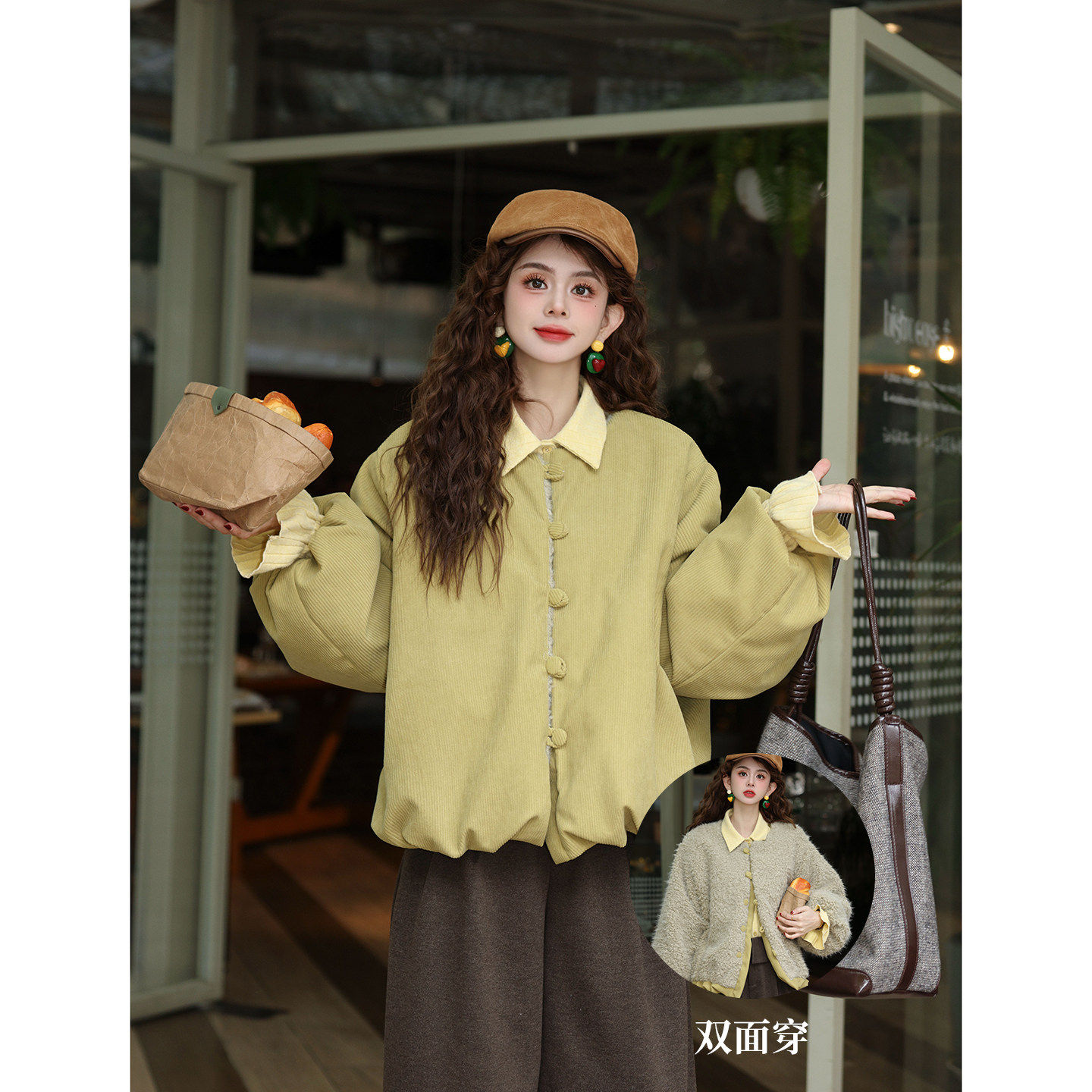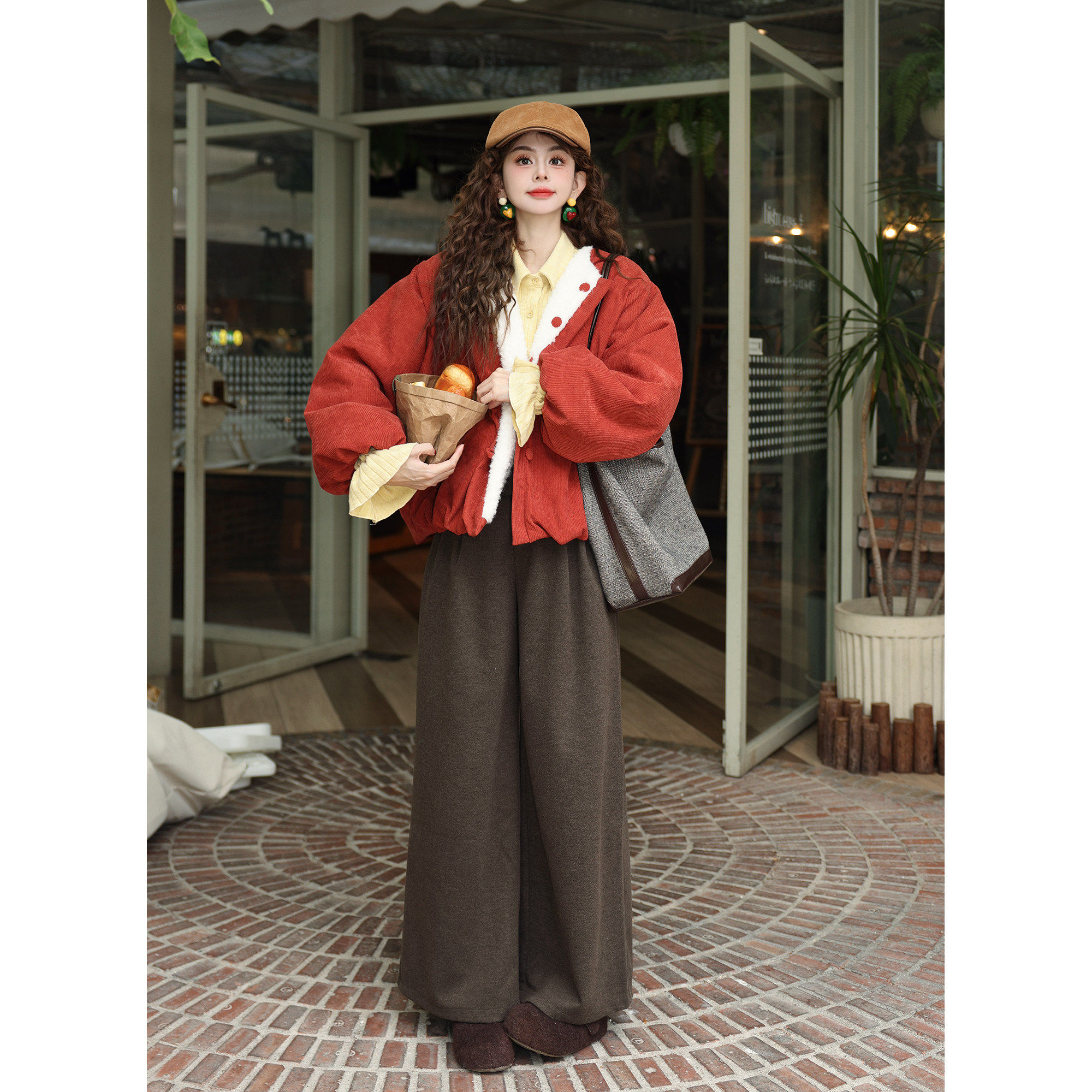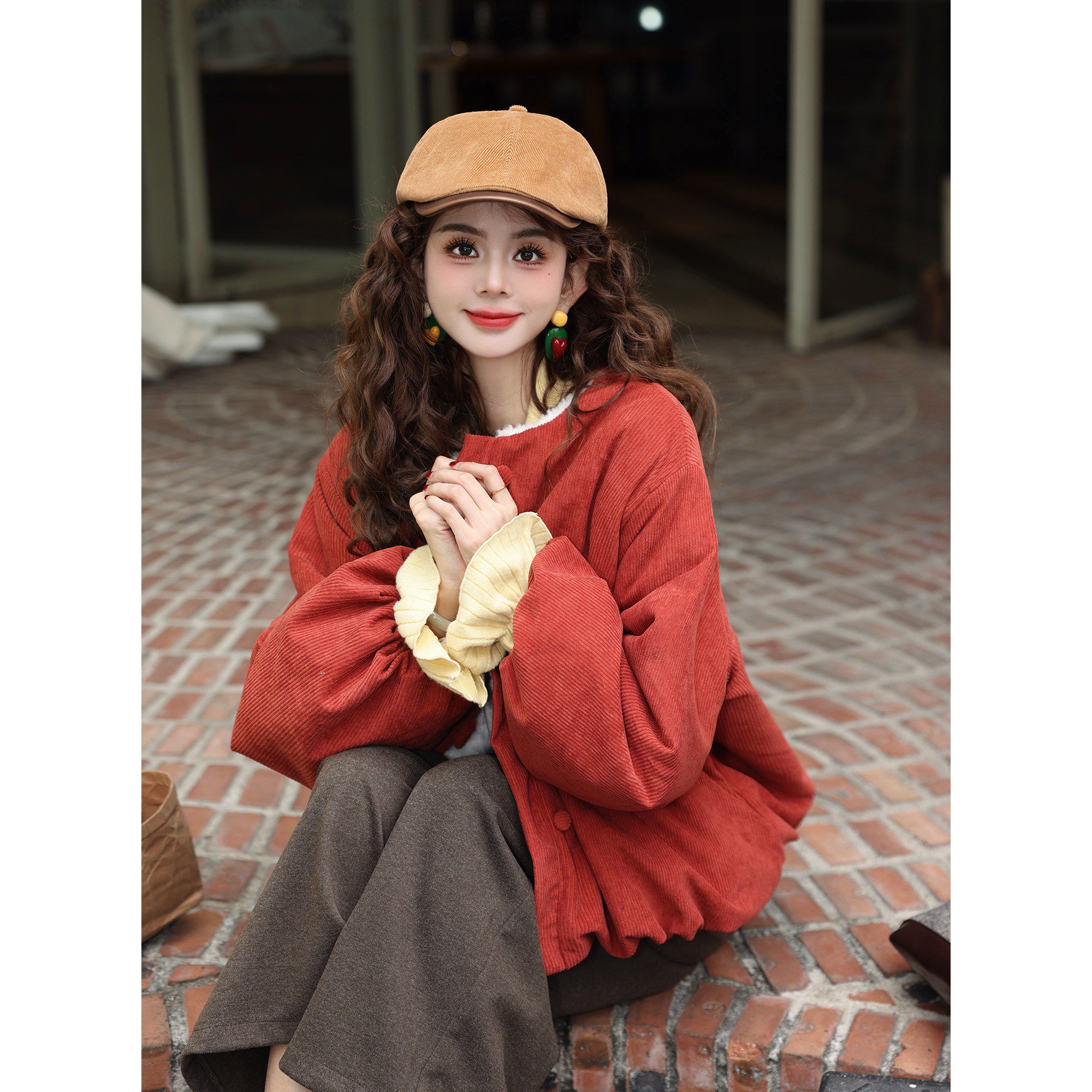 陈佳洁【冬日多巴胺】红色灯芯绒外套女冬季设计感两面穿棉服上衣