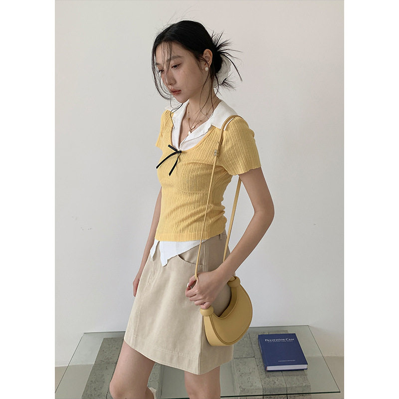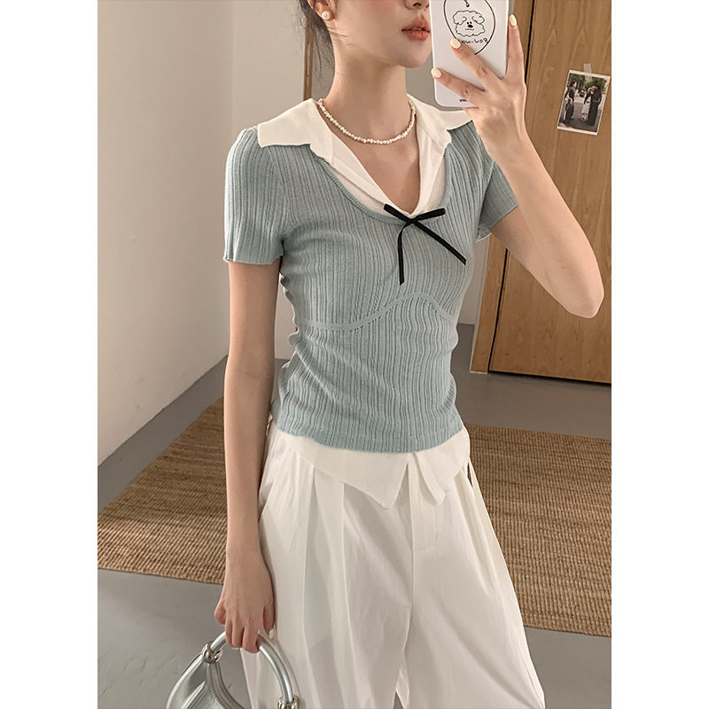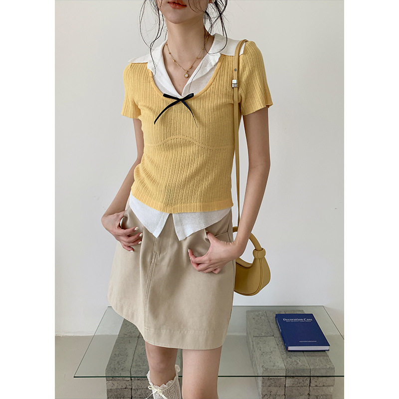 Tania S家26春季新款蝴蝶结假两件显瘦温柔风针织衫短袖翻领上衣