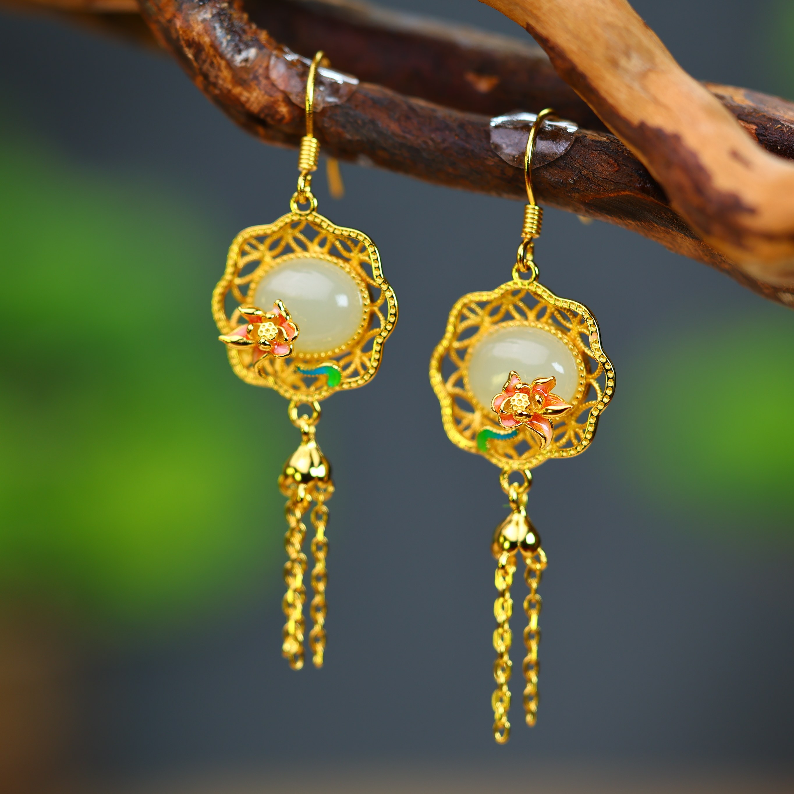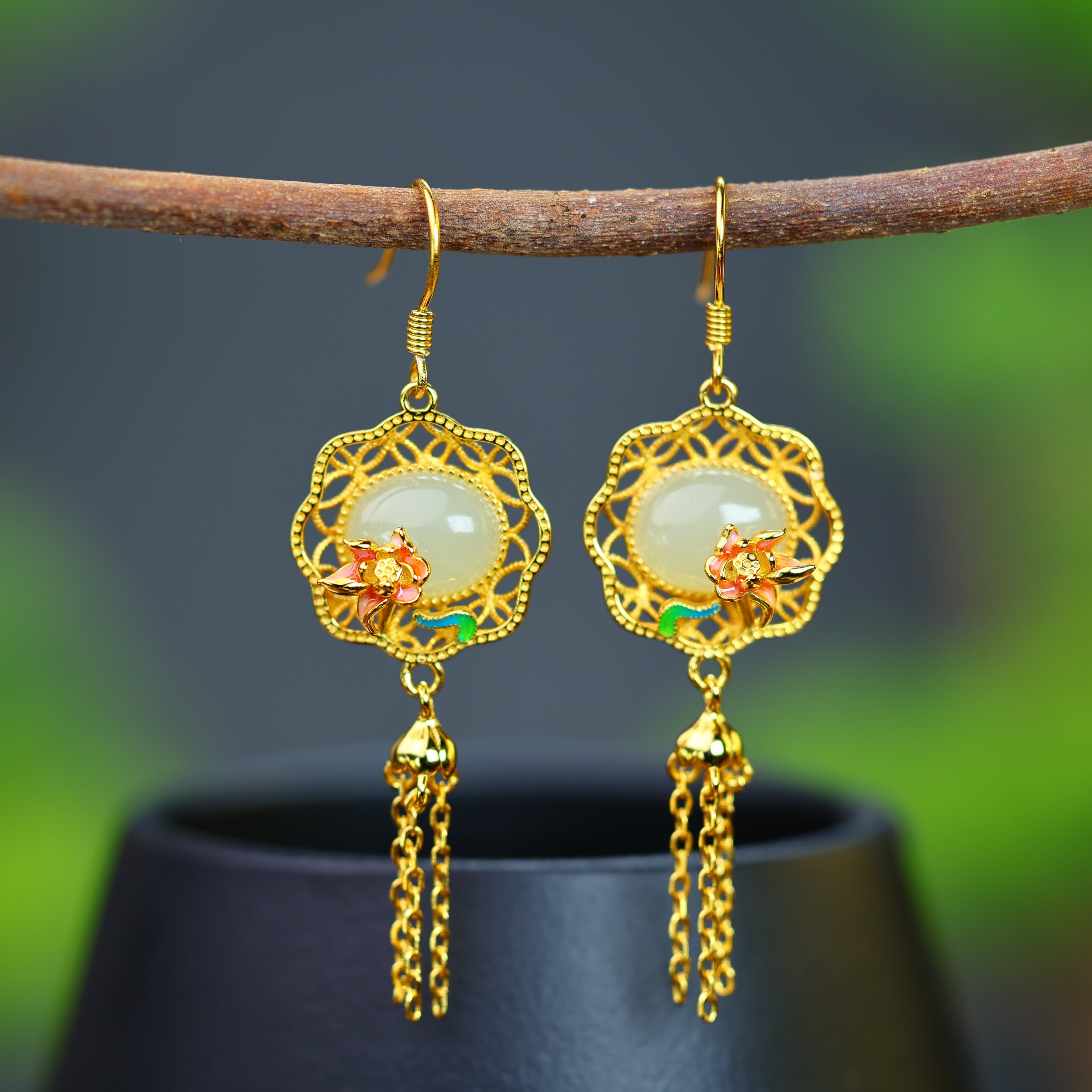 天然和田玉白玉蛋面925银镶嵌古法金珐琅流苏耳坠玉石耳石耳环