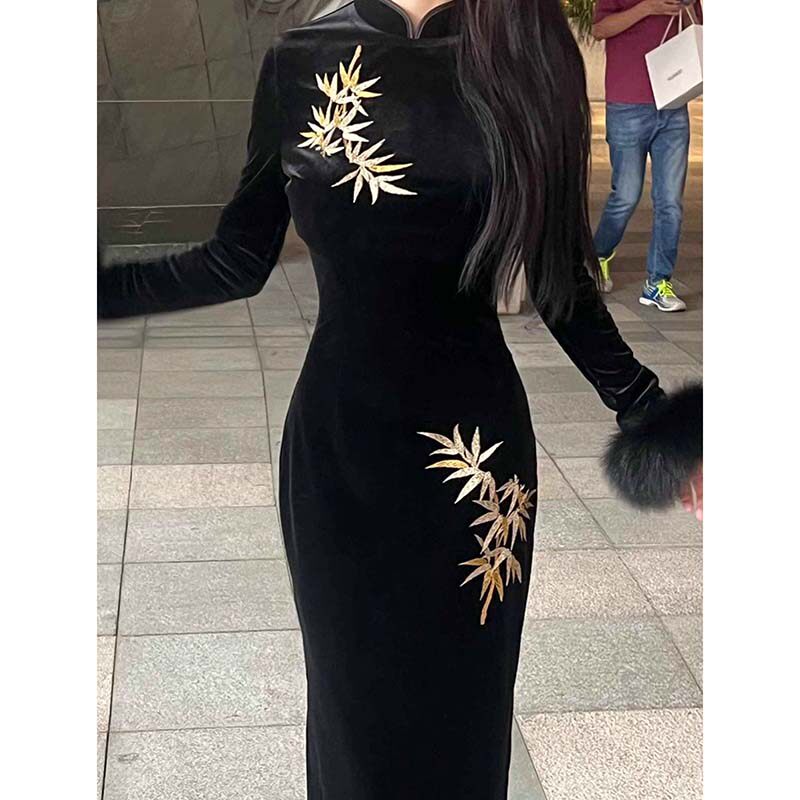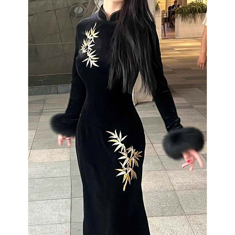 2025秋冬季新款加绒加厚新中式国风高端旗袍长袖连衣裙D4150