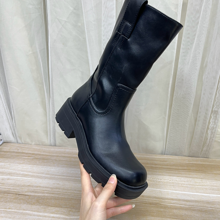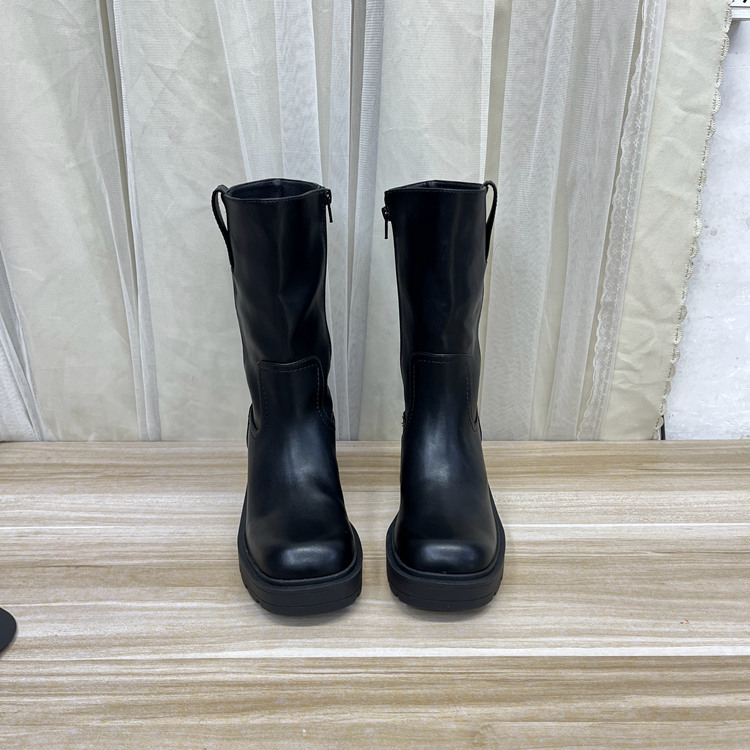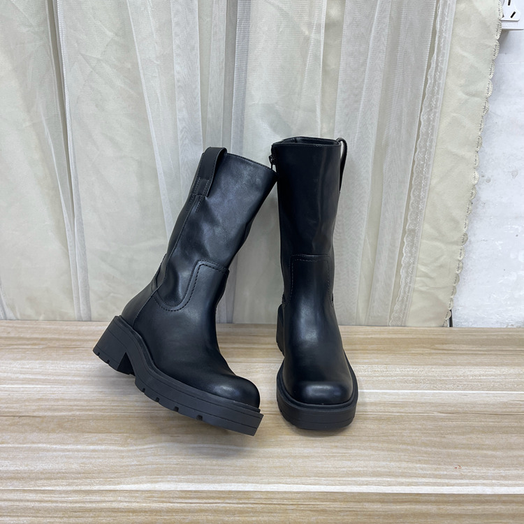 外贸原单女靴新款时尚shoes圆头纯色粗跟侧拉链百搭中筒靴时装靴