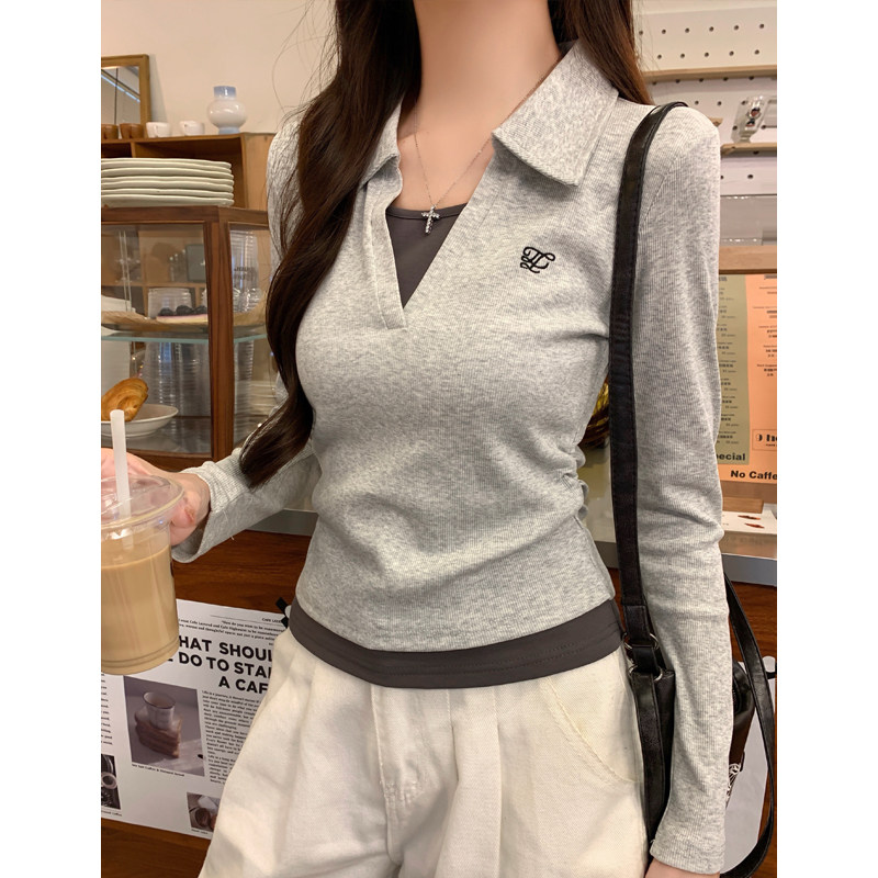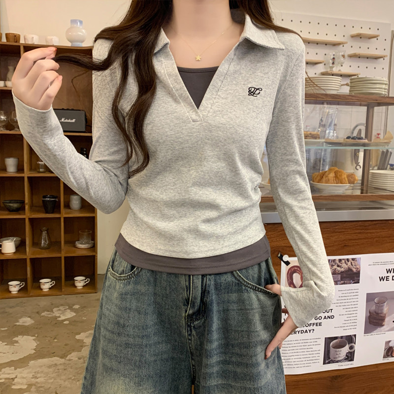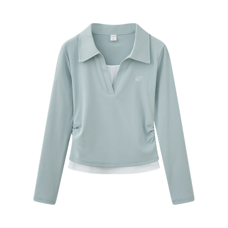 蓝色polo领长袖打底T恤女2025秋可盐可甜假两件刺绣褶皱显白上衣