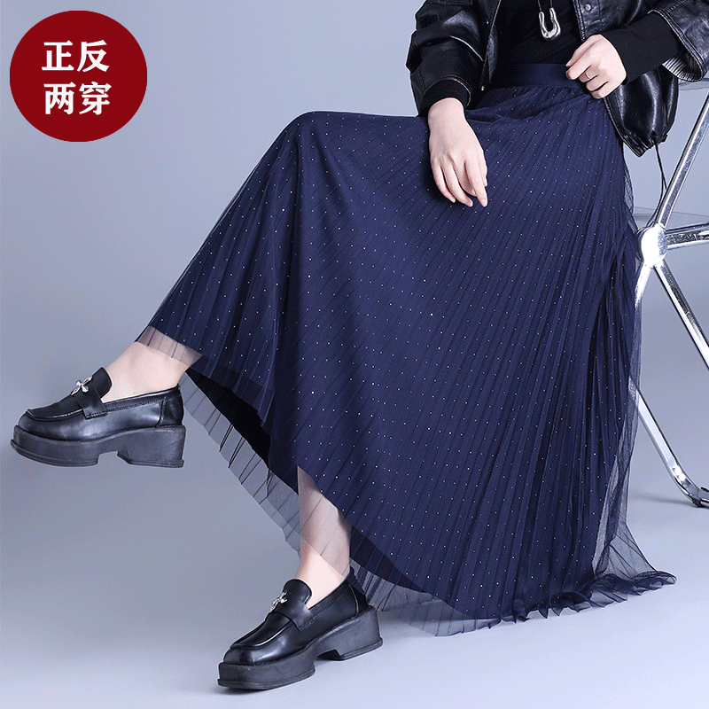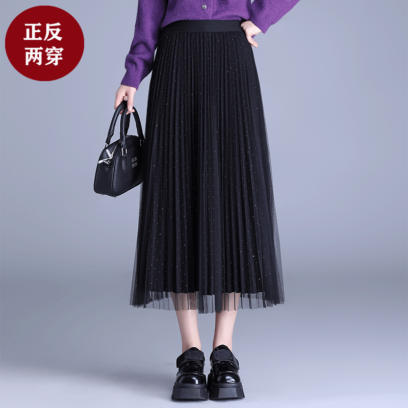 首页> 女装> 高端两面穿烫钻星空网纱半身裙长裙女2025秋冬新款高腰a字百褶裙