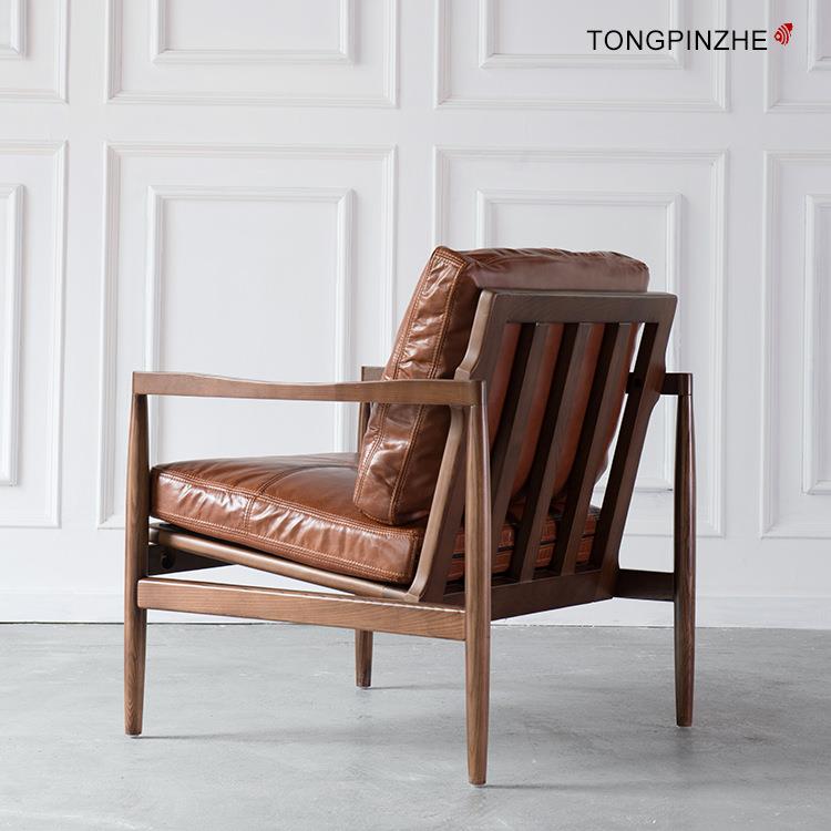 北欧实木休闲单人沙发椅 白蜡木躺椅真皮羽绒通体打磨现货