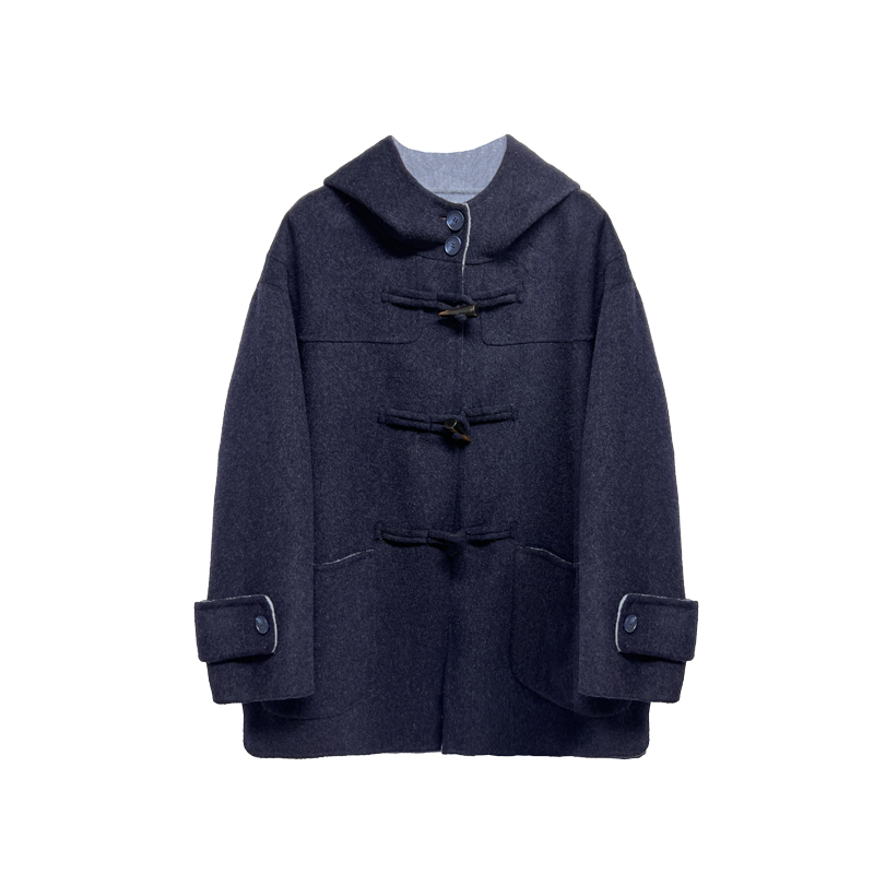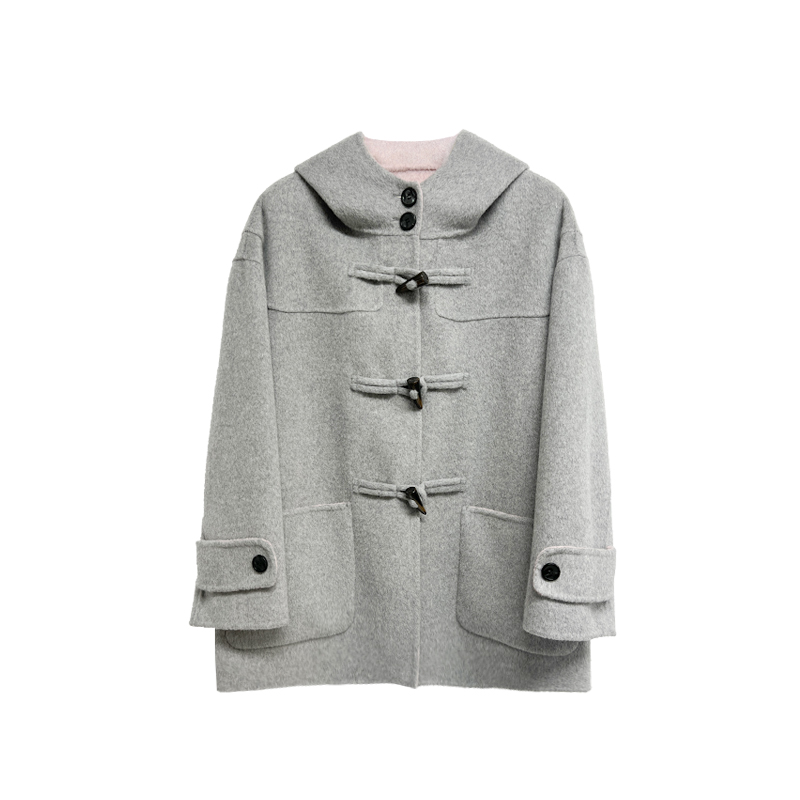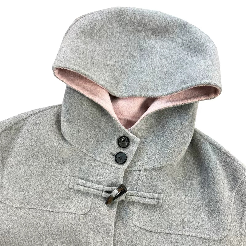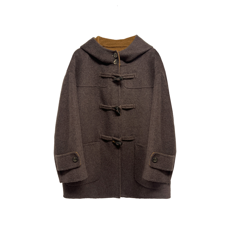 【橙庐】509183绵羊毛山羊绒双面呢牛角扣连帽大衣 女款毛呢外套