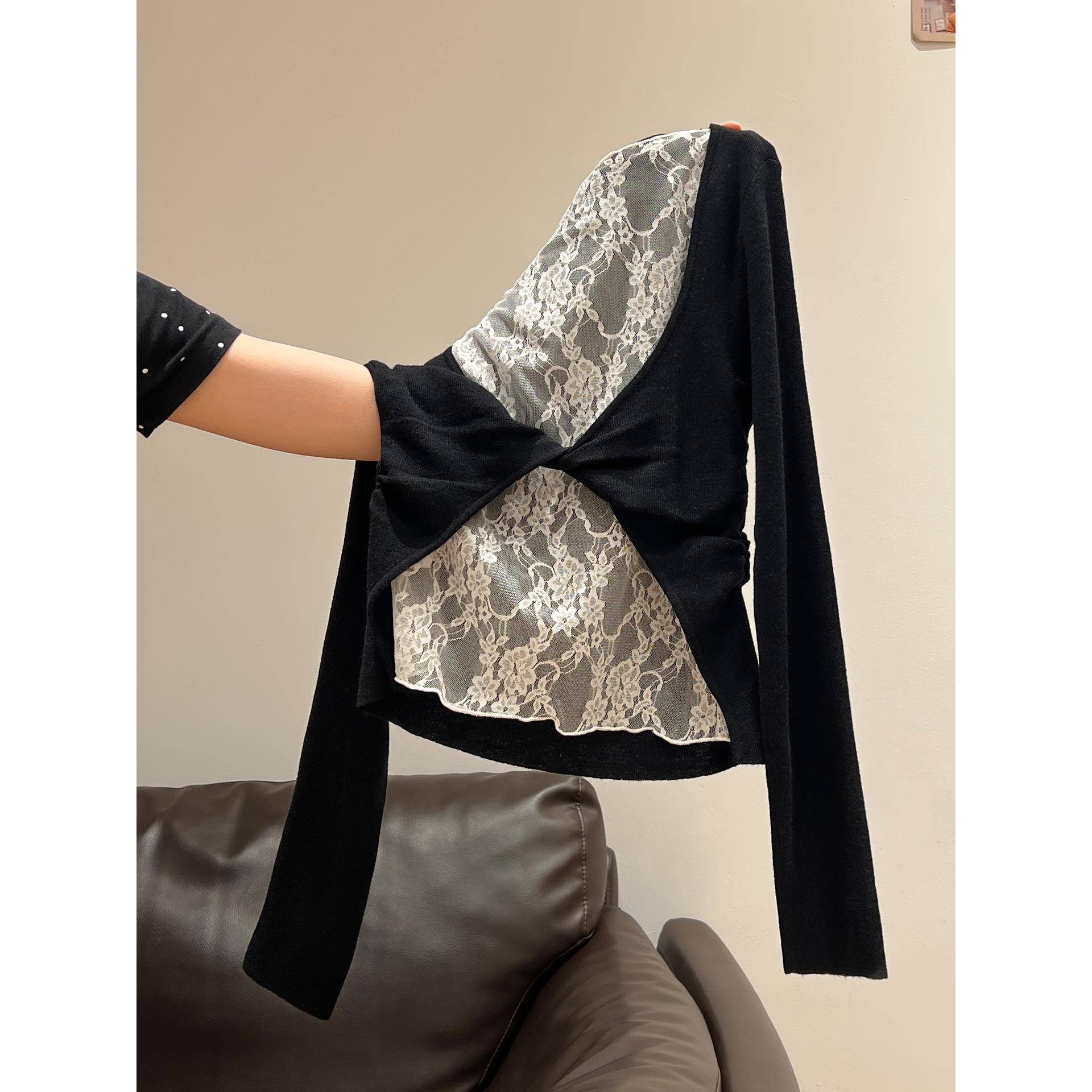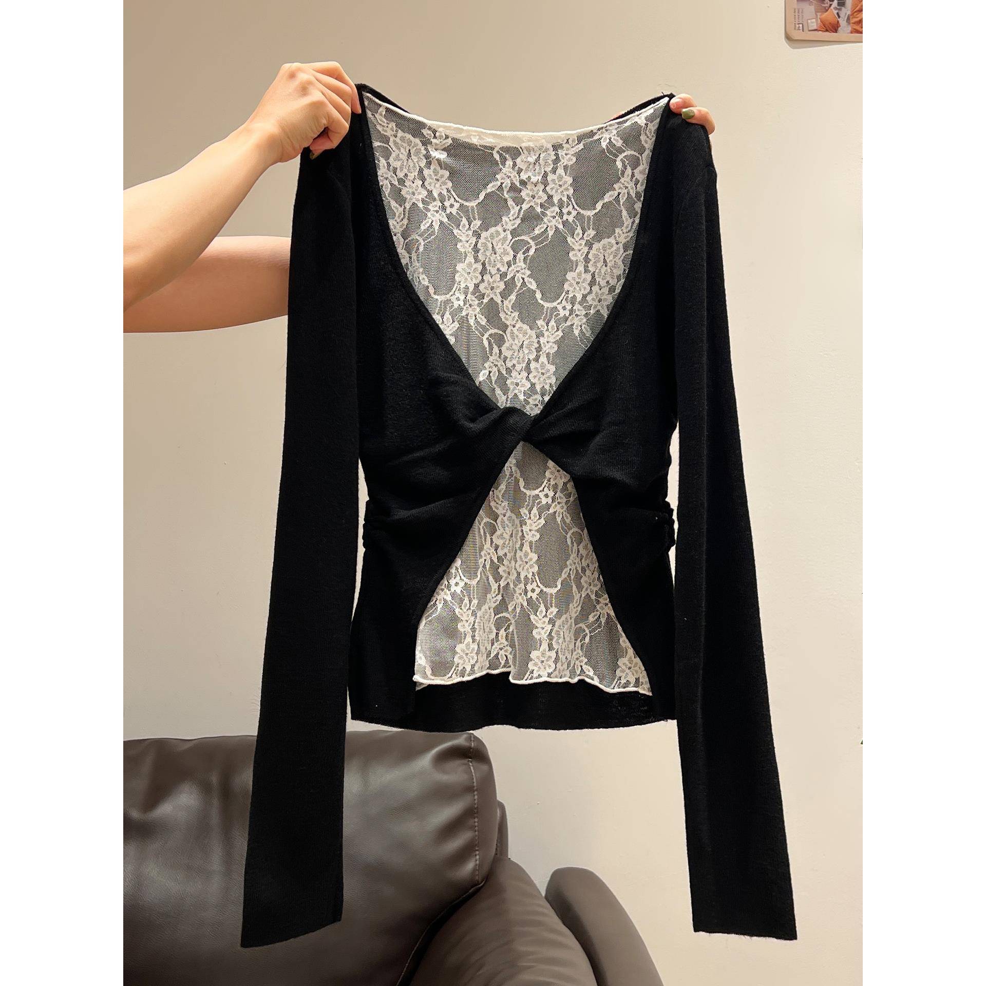 纯欲黑色蕾丝露背拼接针织衫女2025早秋新款褶皱扭结收腰内搭上衣