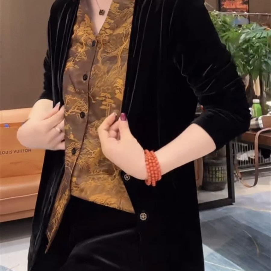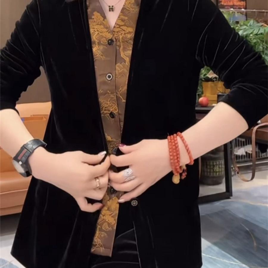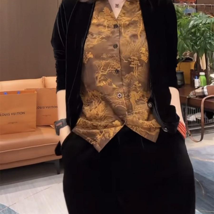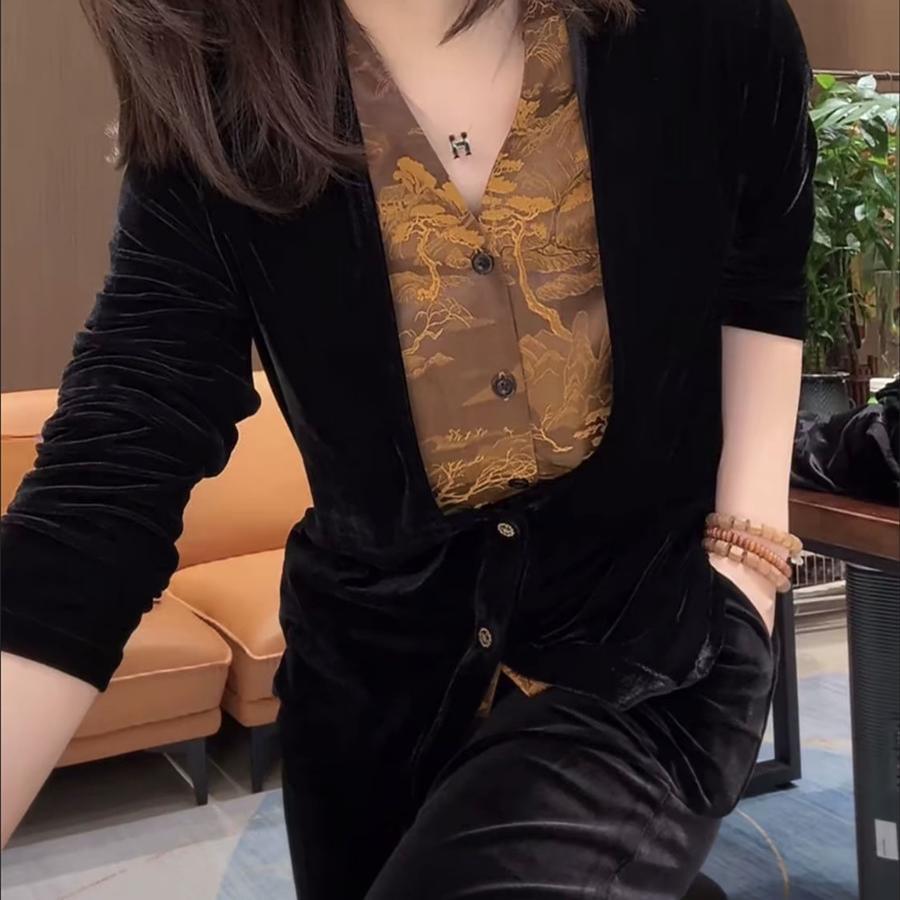 新中式复古印花拼接丝绒衬衫春秋新款时尚洋气假两件长袖上衣开衫