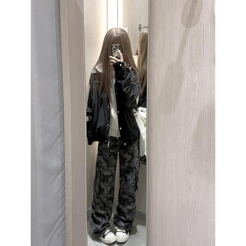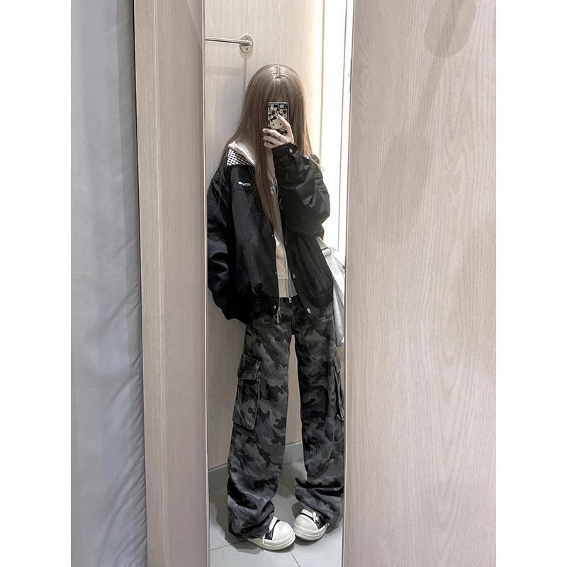 高个子加长美式迷彩工装裤女秋冬新款高腰显瘦宽松直筒拖地牛仔裤