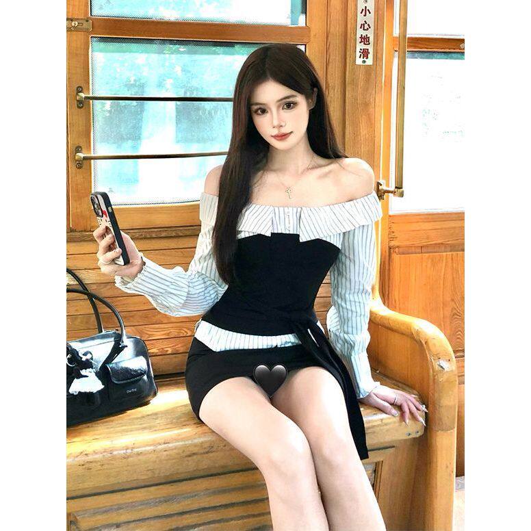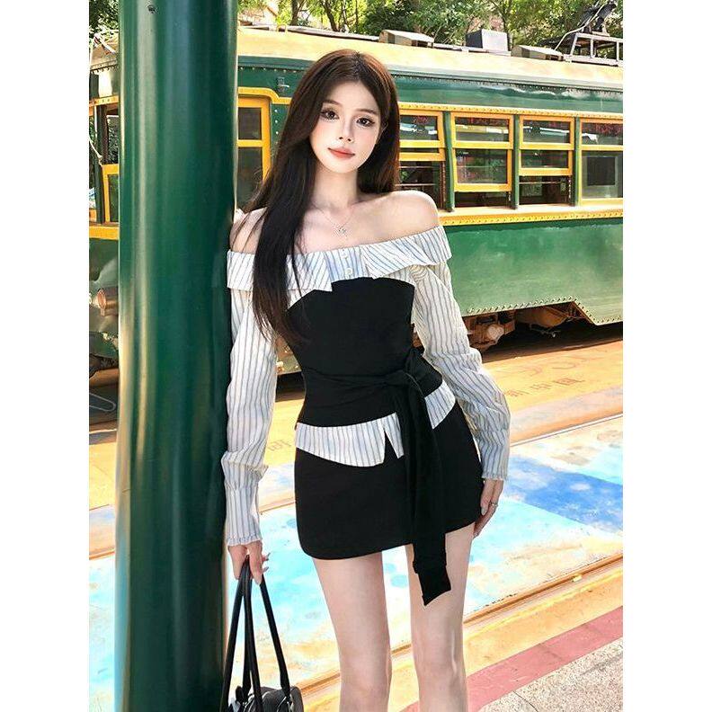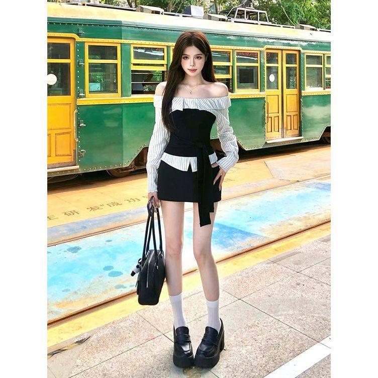 【伯德小姐】早秋拼接设计感百搭条纹上衣黑色半裙修身显瘦两件套