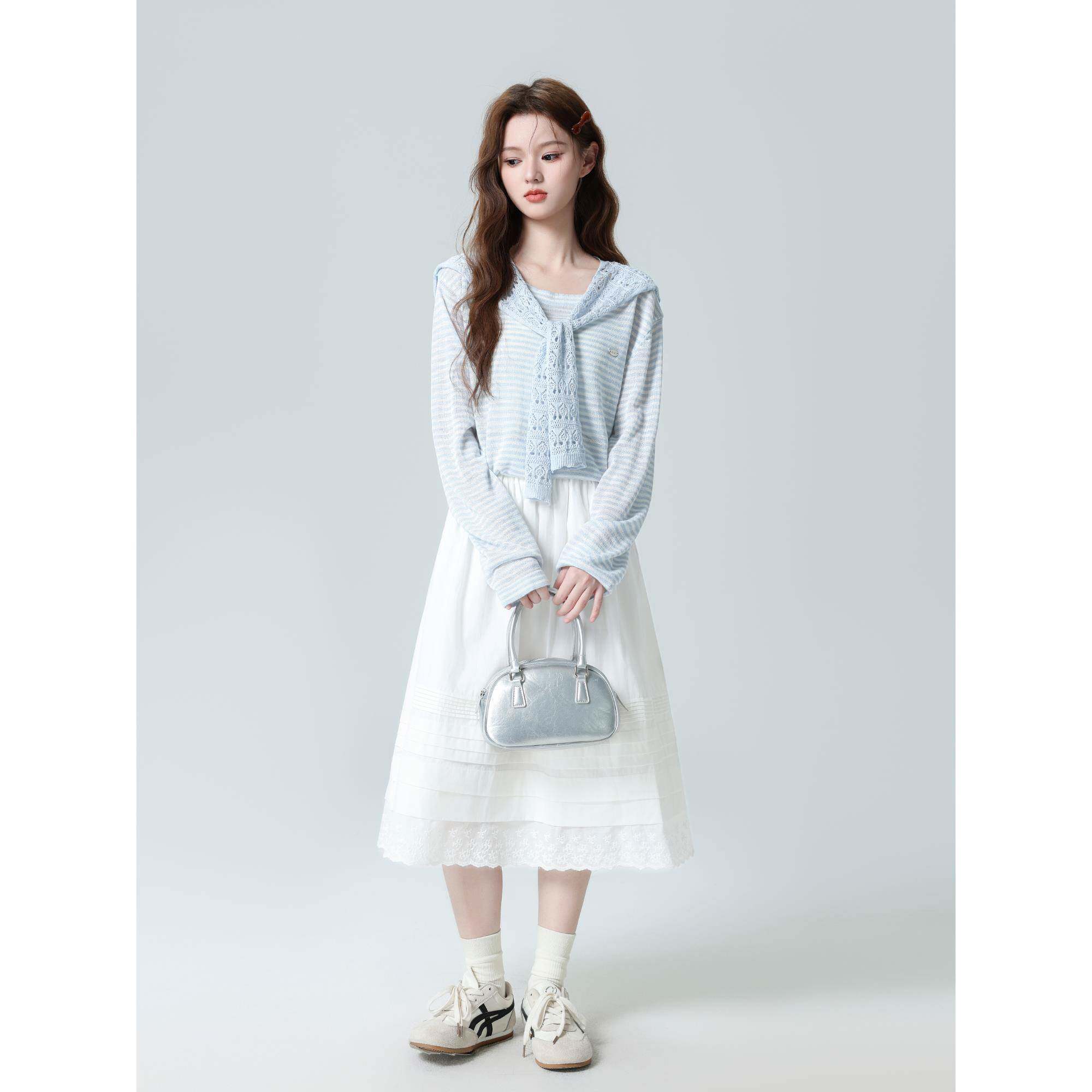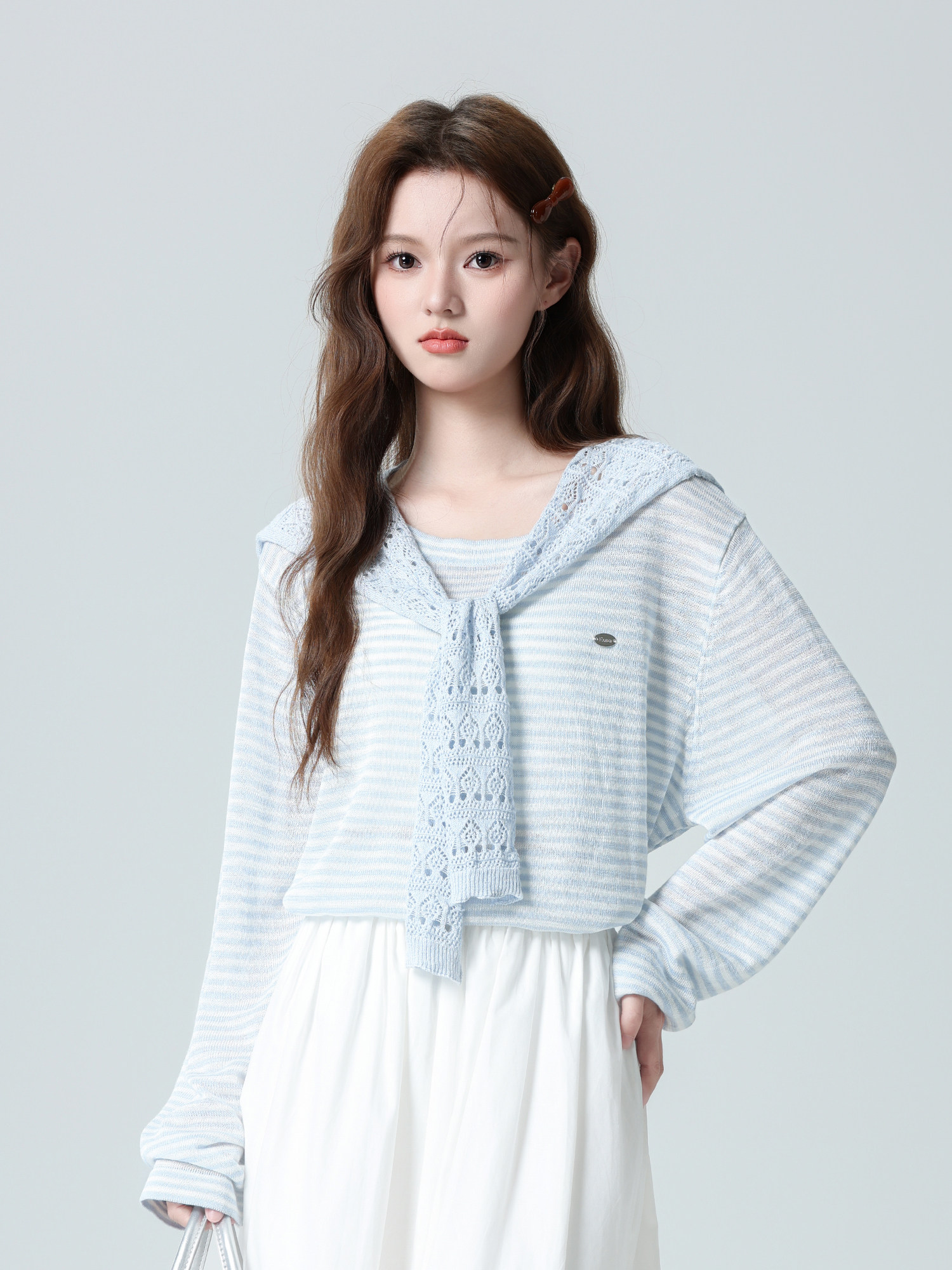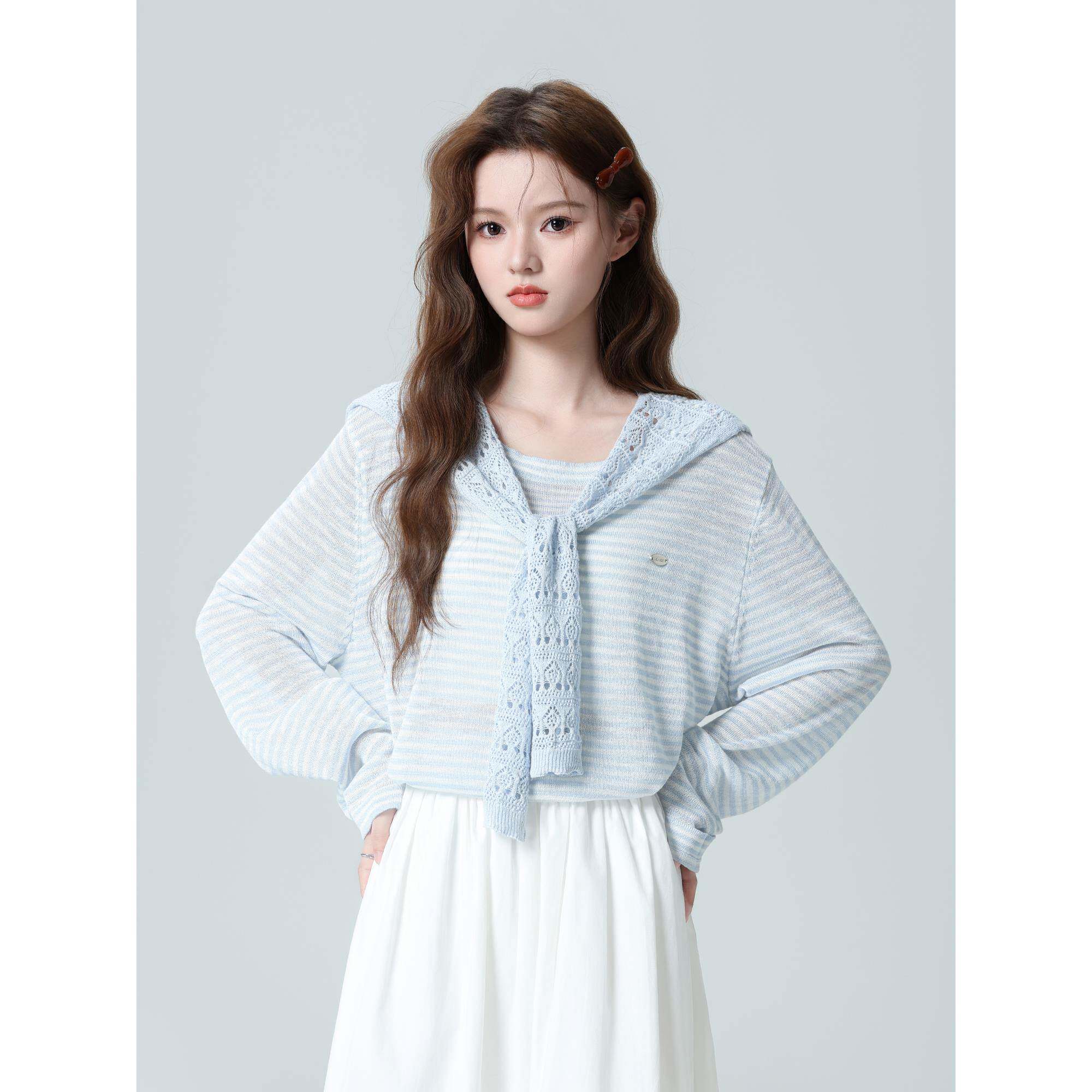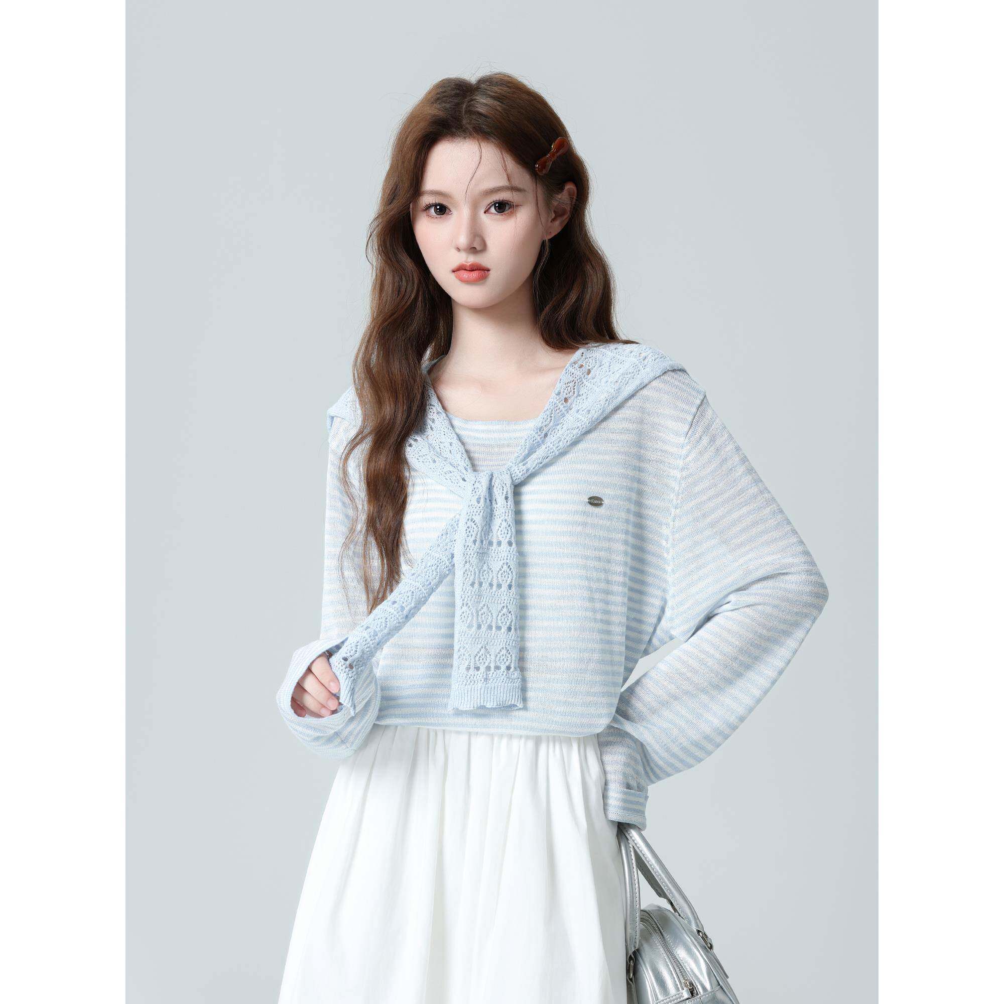 蓝色条纹长袖T恤女早秋2025春秋新款设计感宽松披肩系带薄款上衣