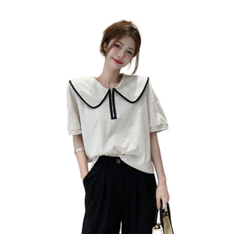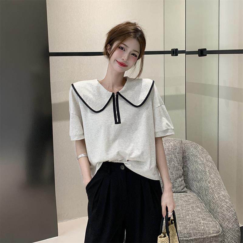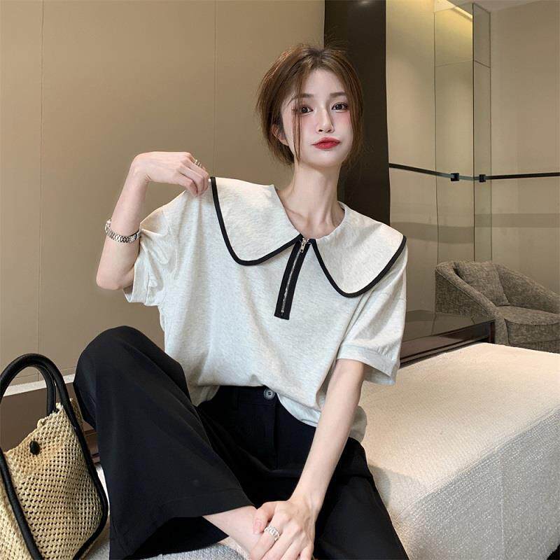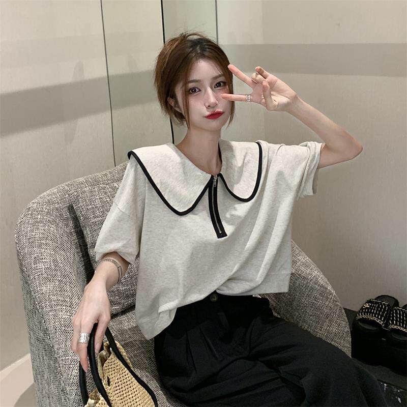 花灰色娃娃领T恤女夏2025新款短袖拉链短款纯棉高端宽松显瘦上衣