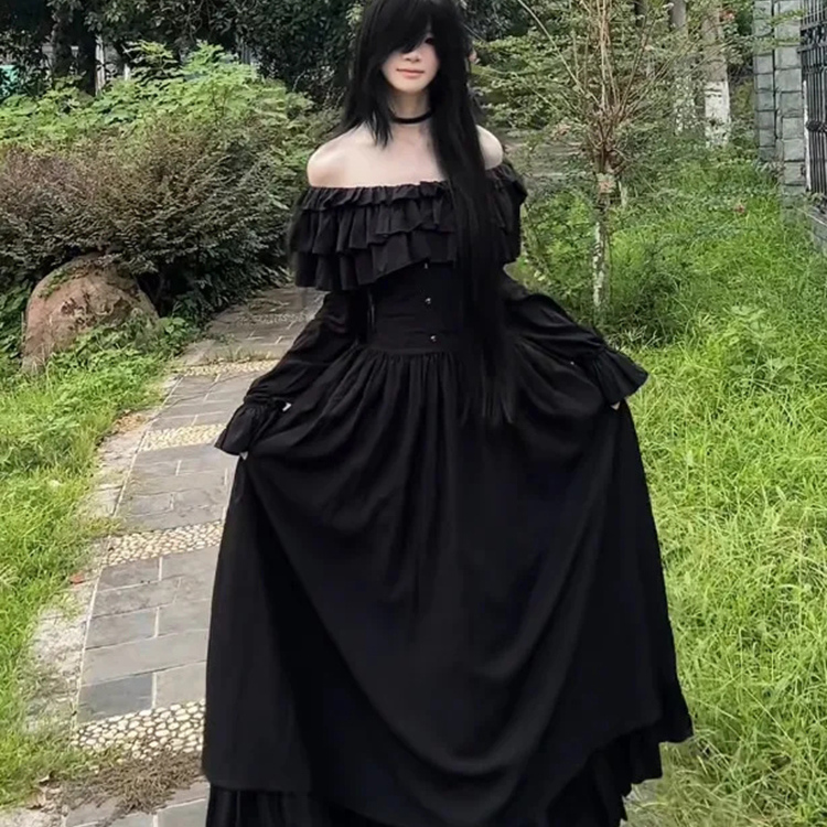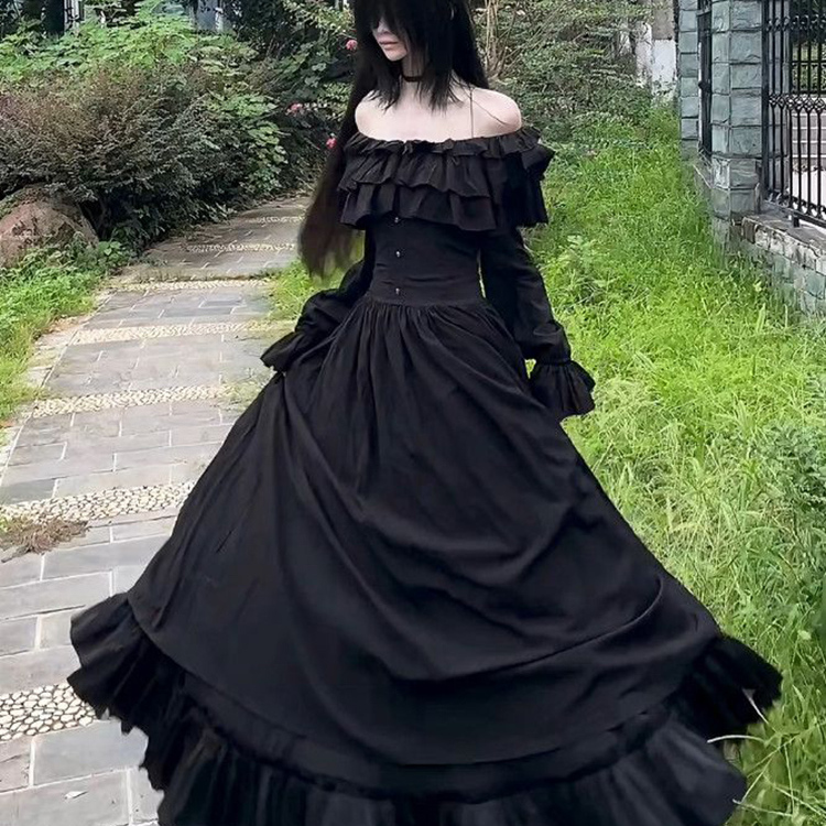 【优雅舞步】日系哥特风一字肩连衣裙暗黑系洛丽塔荷叶边收腰长裙