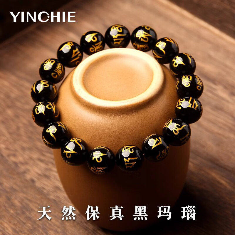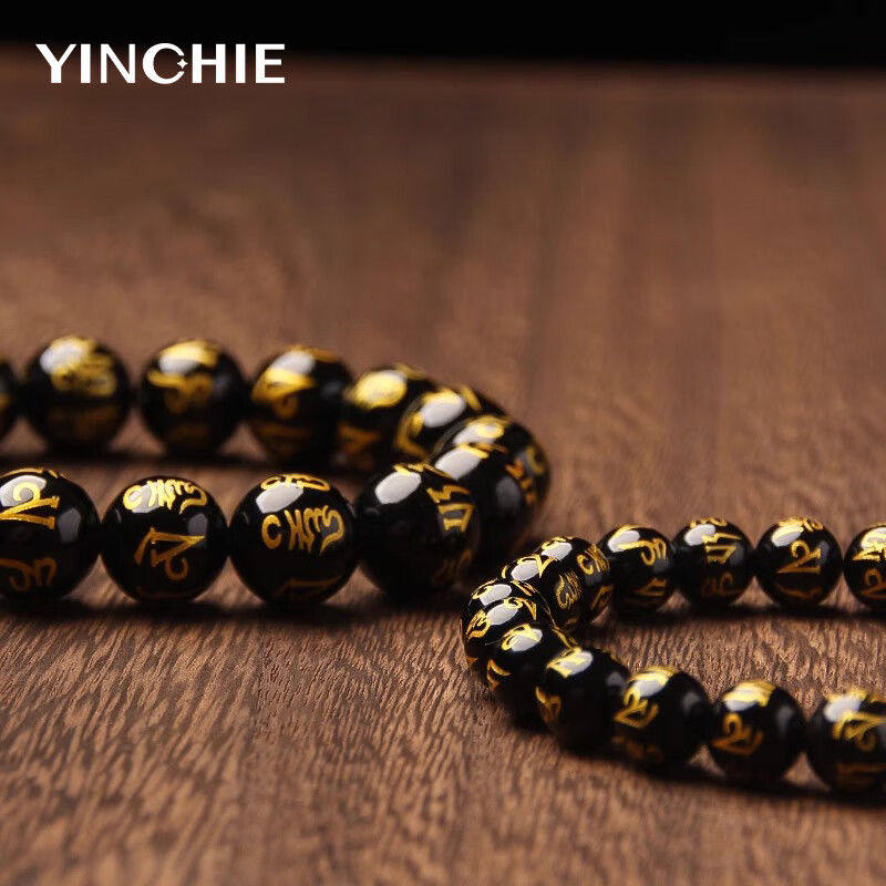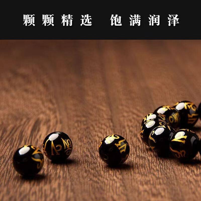 六字箴言佛珠手串黑玛瑙烫金转运礼物礼物送长辈男友P