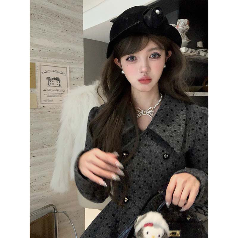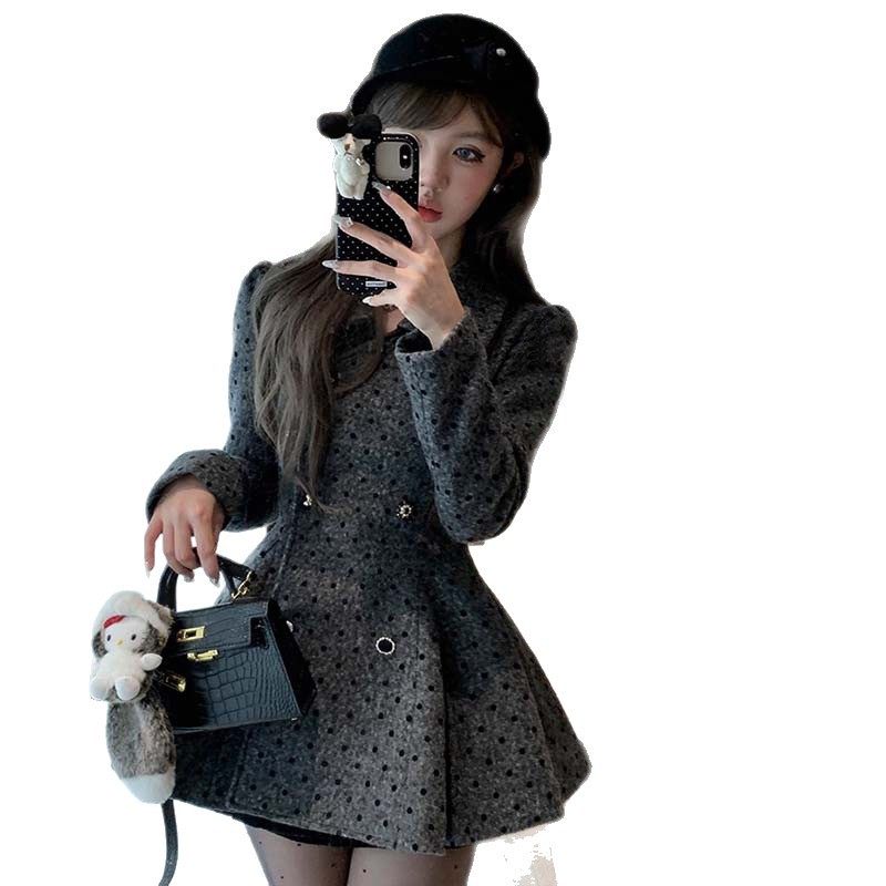 秋冬复古波点毛呢娃娃领双排扣连衣裙女千金风收腰显瘦灰色连衣裙
