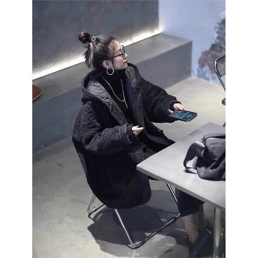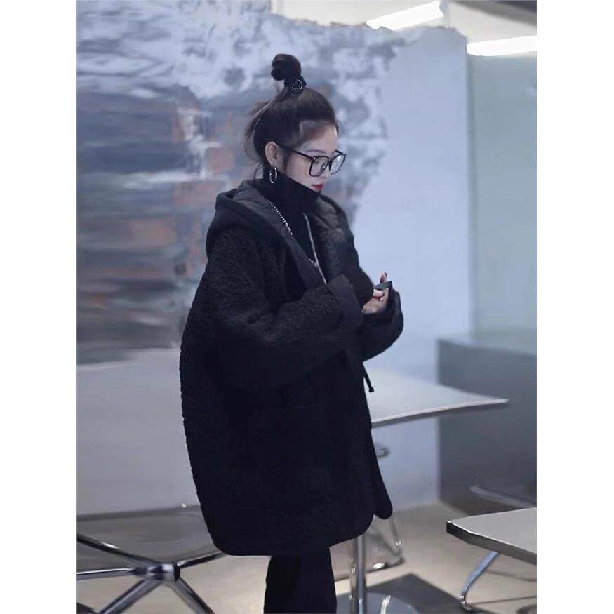黑色连帽羊羔毛外套女秋冬2024新款小个子爆款高级感夹棉加厚上衣