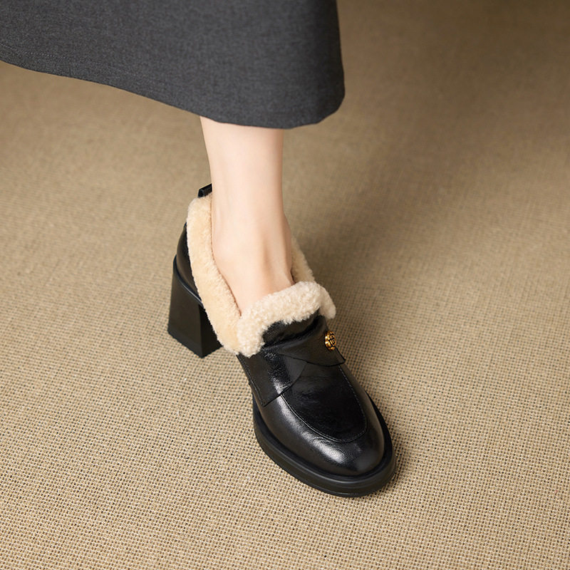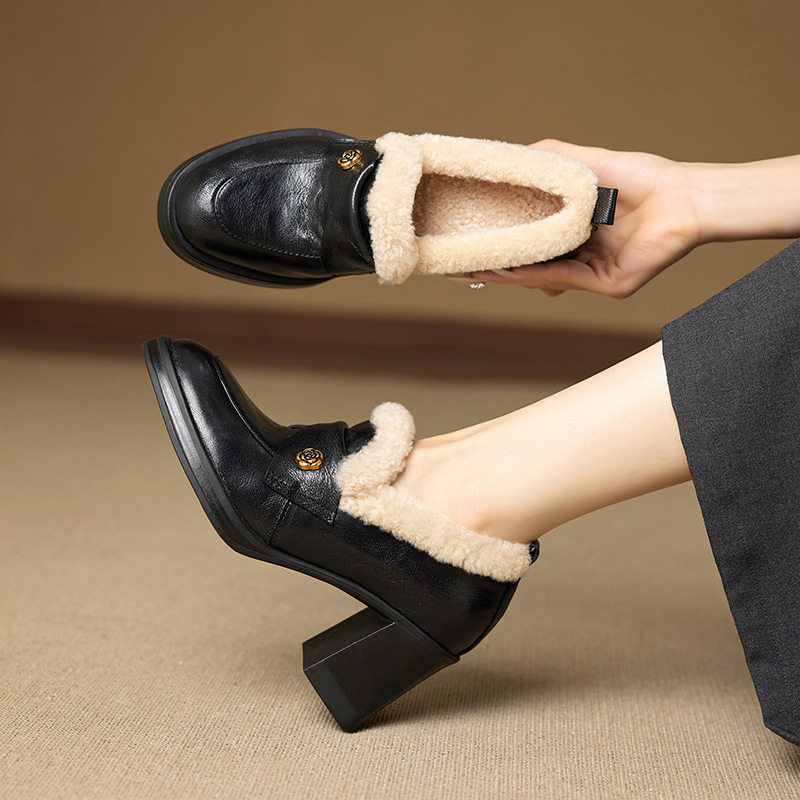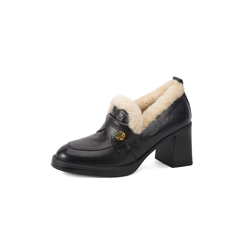 学院风山茶花圆头加绒加厚7.5cm粗跟高跟深口单鞋一脚蹬小皮鞋女