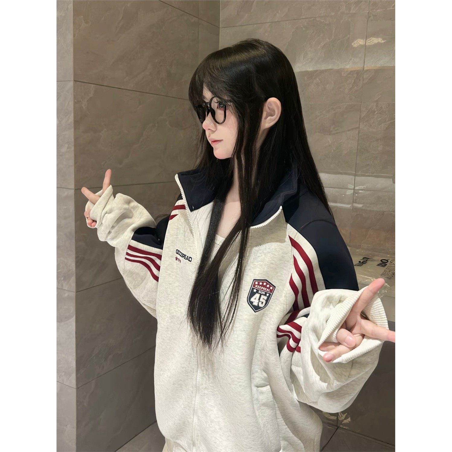 美式覆古撞色条纹徽章字母立领卫衣外套女春秋学院风开衫夹克上衣