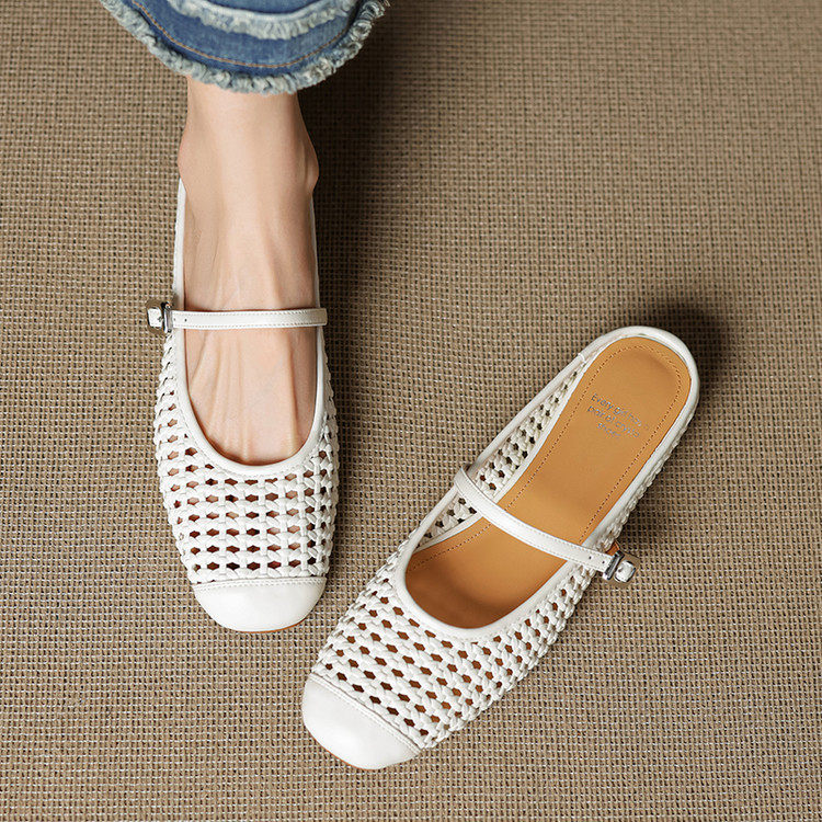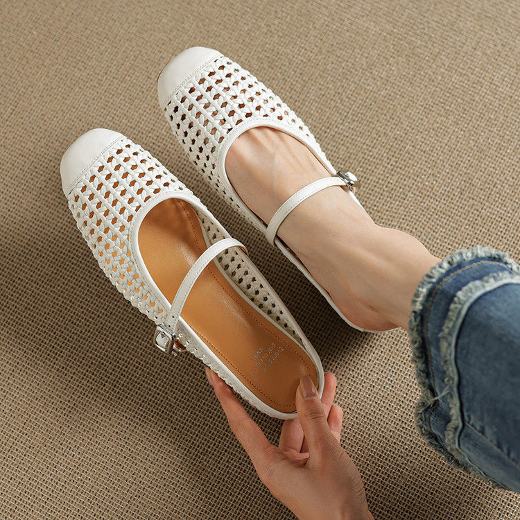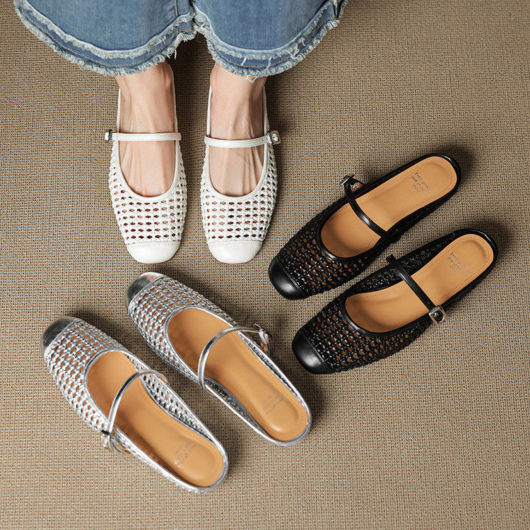 法式编织镂空透气包头半拖鞋女夏真皮圆头洞洞鞋凉拖一字带穆勒鞋