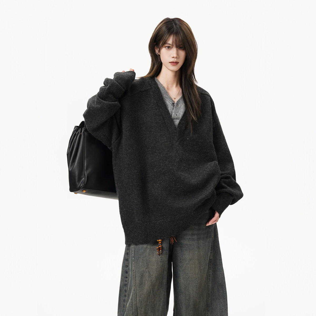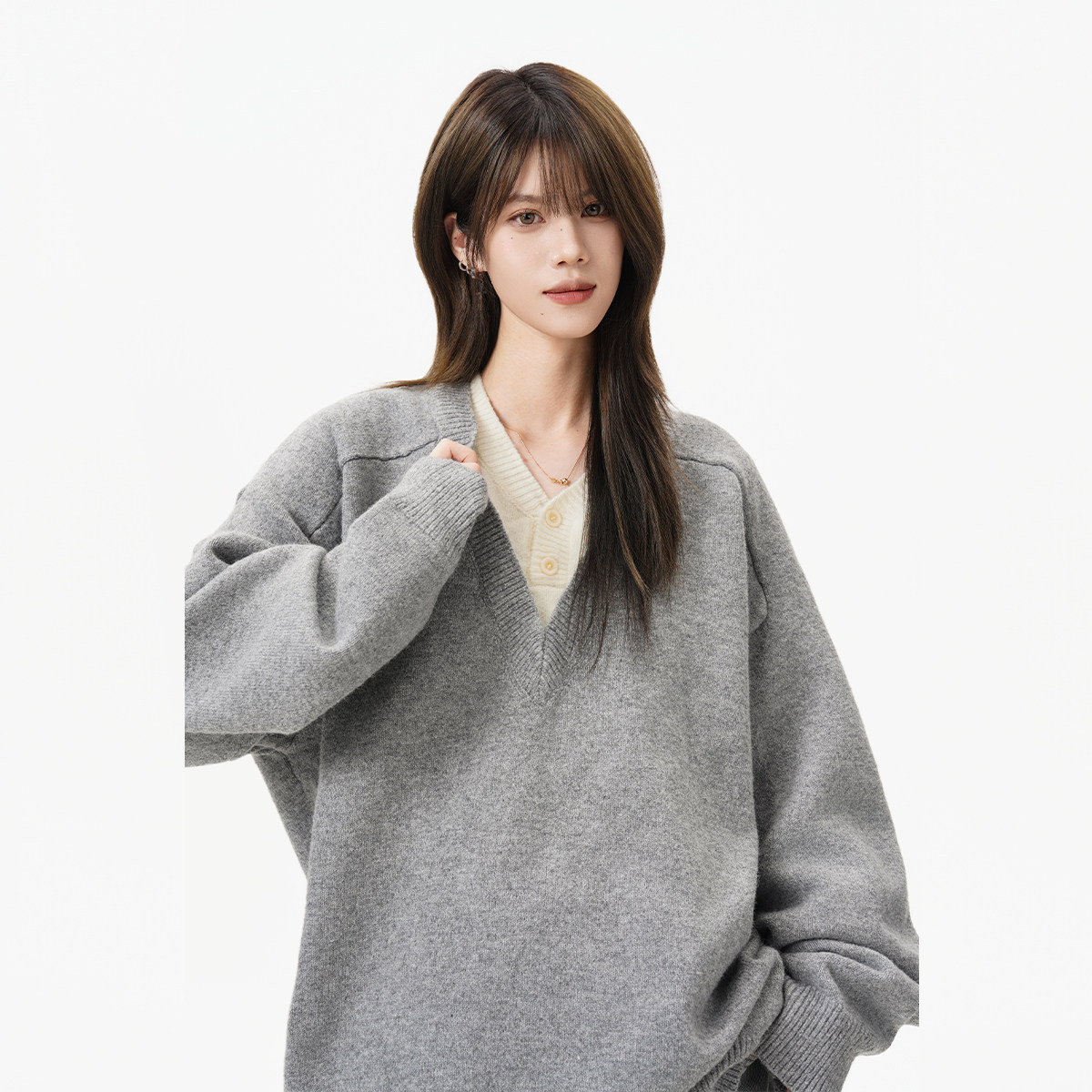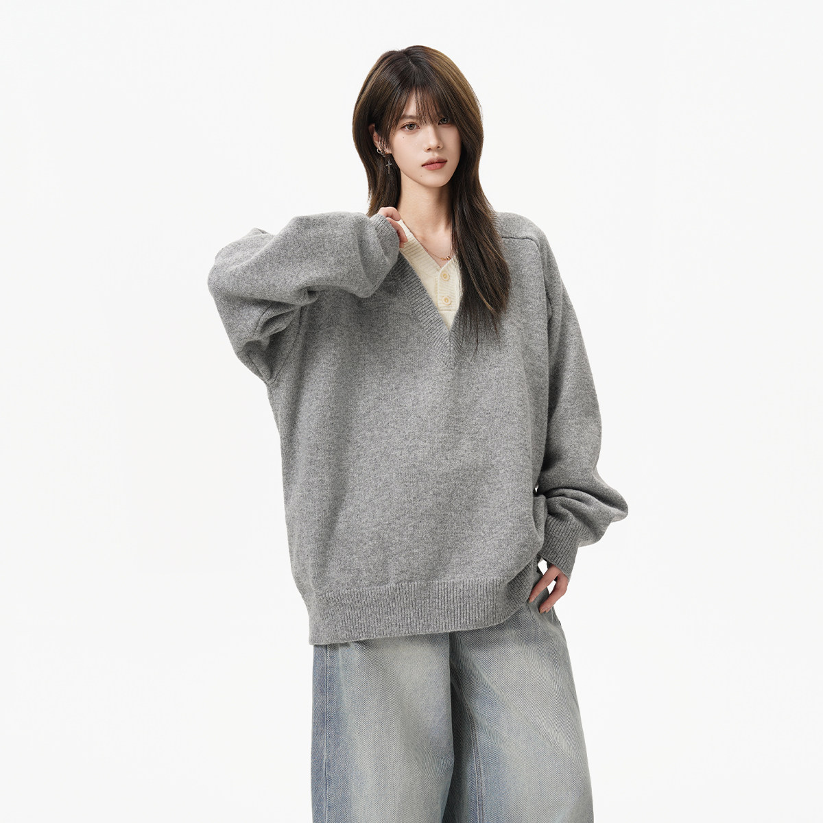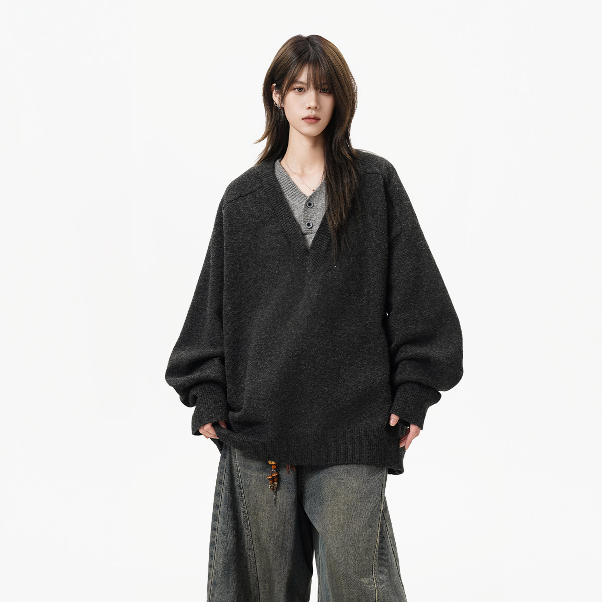 重磅假两件V领针织衫女男秋冬复古慵懒休闲毛衣老钱风内搭打底衫