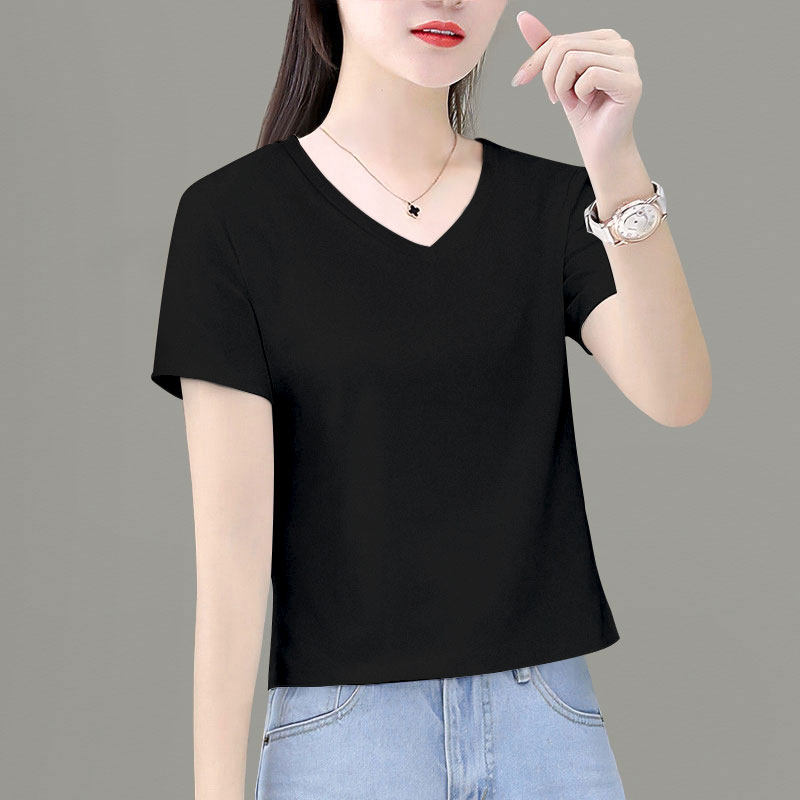 夏季短袖2025白色新款领短体恤小个子纯棉百搭女高腰v上衣恤t纯色