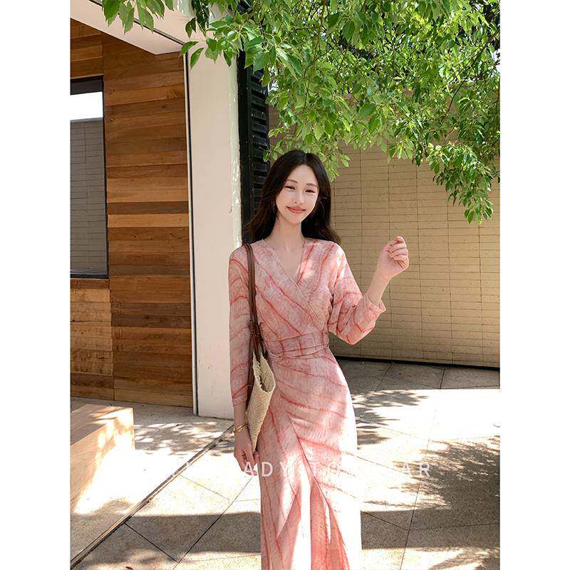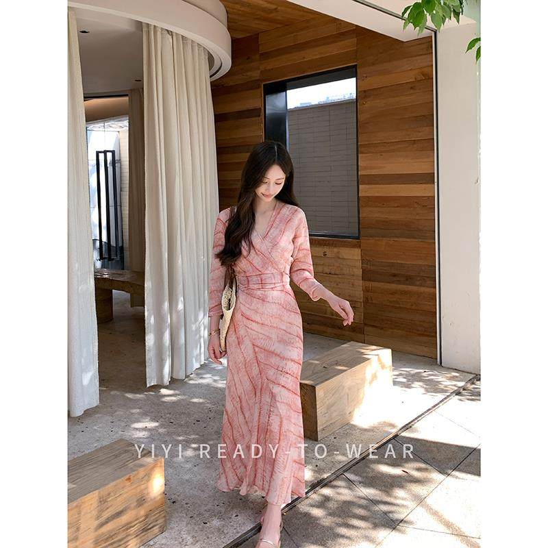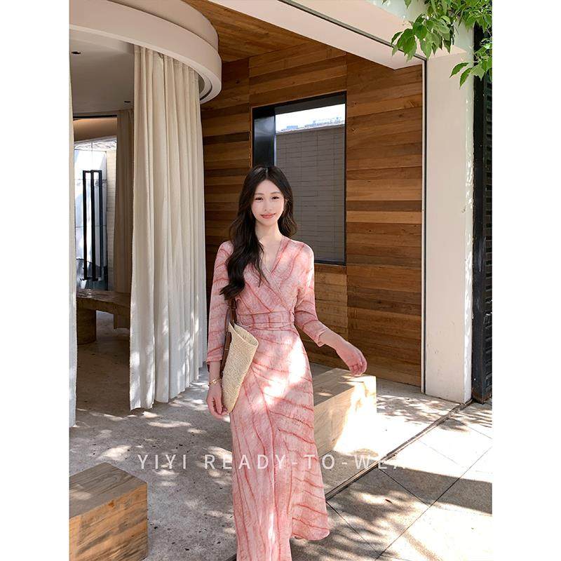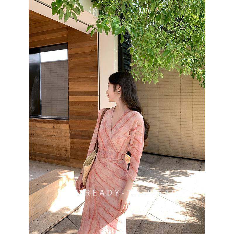 [私有浪漫]小个子粉色晕染V领气质连衣裙女夏新款七分袖系带长裙