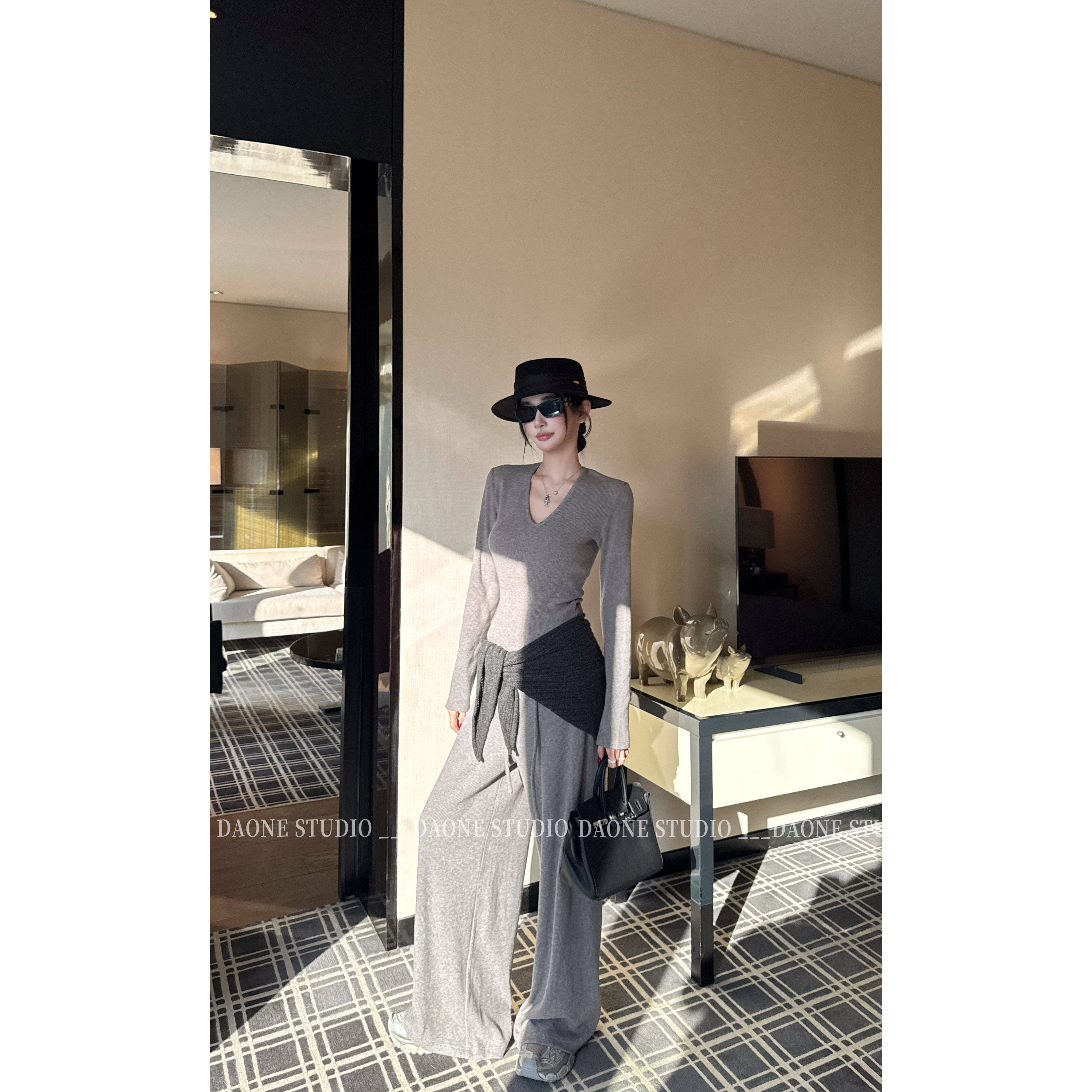 首页> 女装> DAONE 慵懒风秋冬针织加厚百搭收腰打底v领上衣阔腿裤围脖三件套