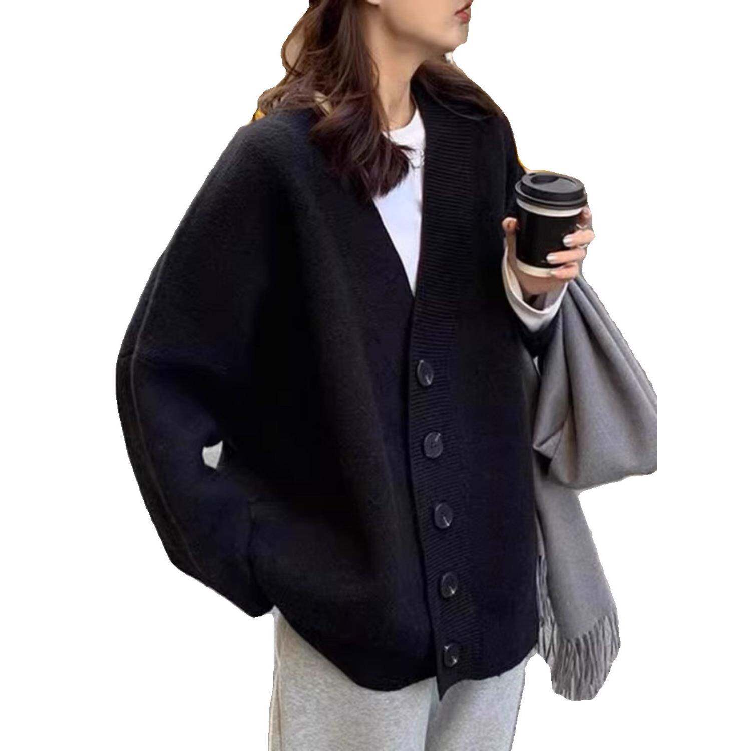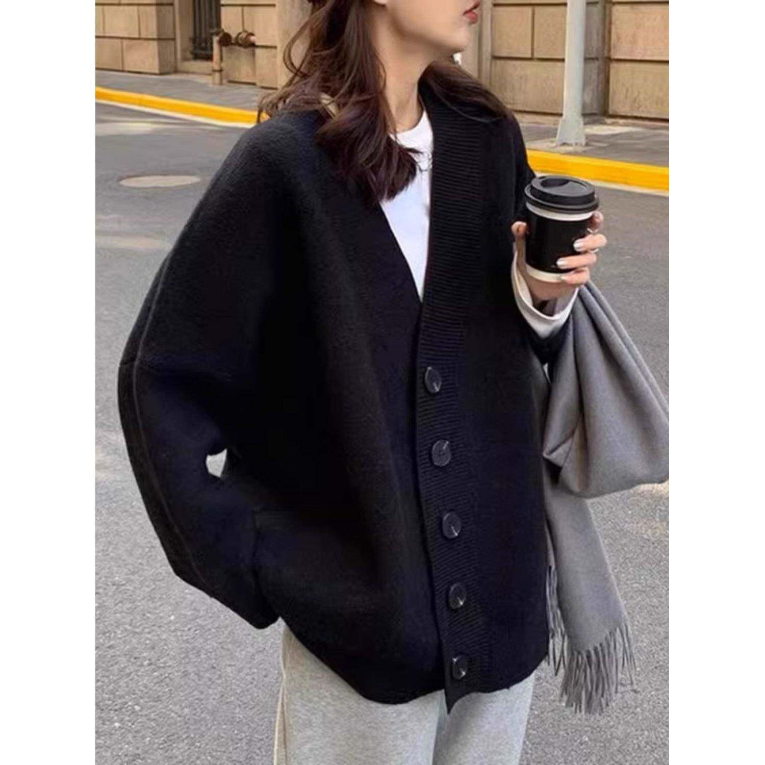 黑厚色毛衣女大码2025加外穿复古套ESK中长外款慵懒宽松v领针织开