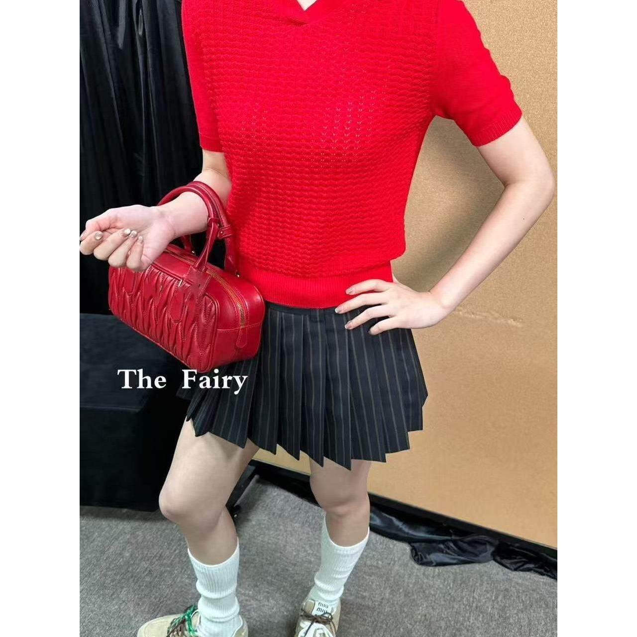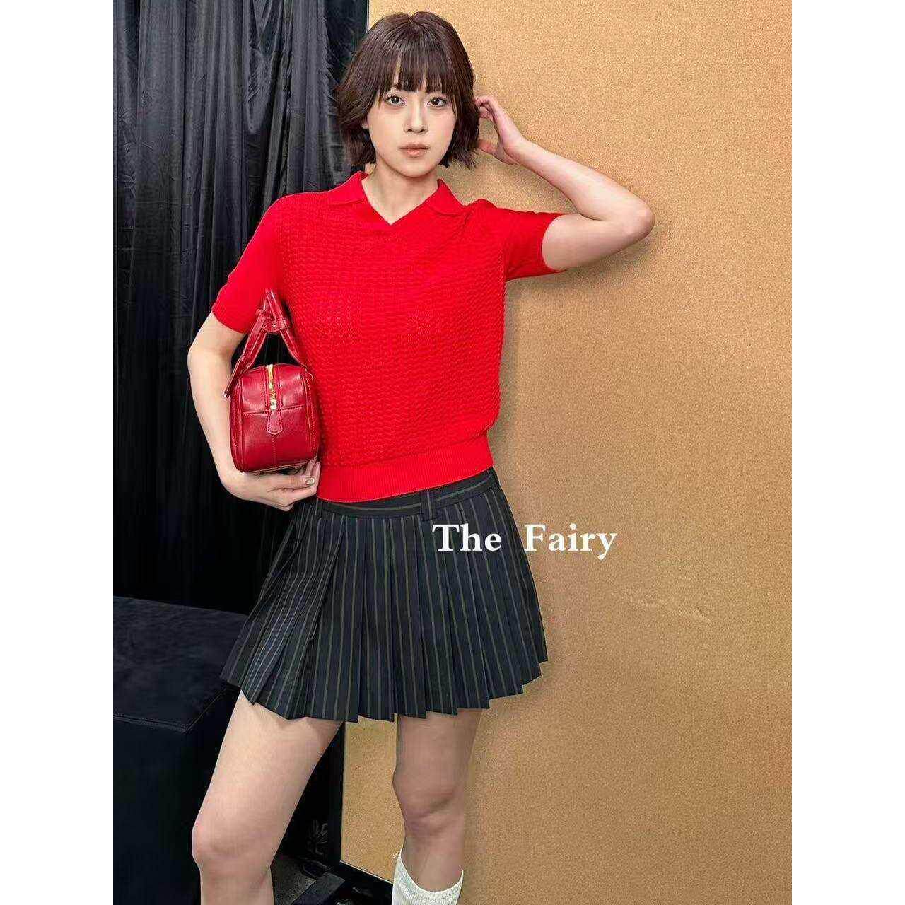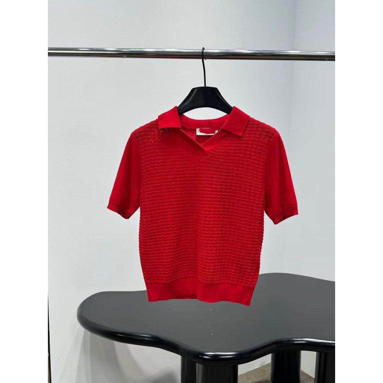 好漂亮翻领针织半袖红色打底衫女2026年早春新款短上衣宽松休闲潮