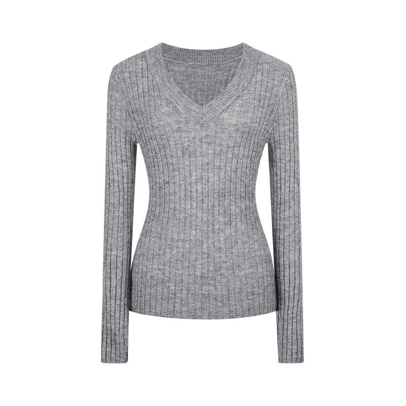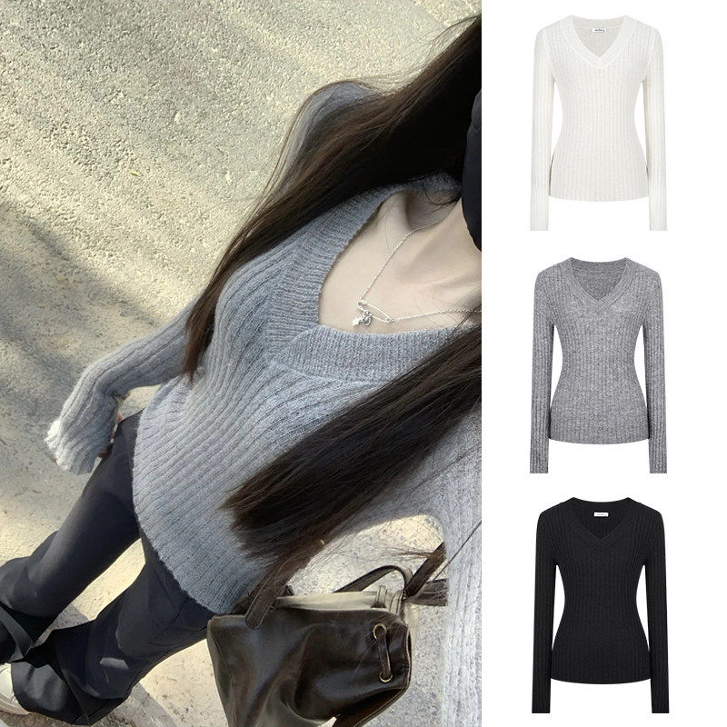 MosesQueen魔西女王灰色V领针织打底衫女春秋冬内搭毛衣长袖上衣