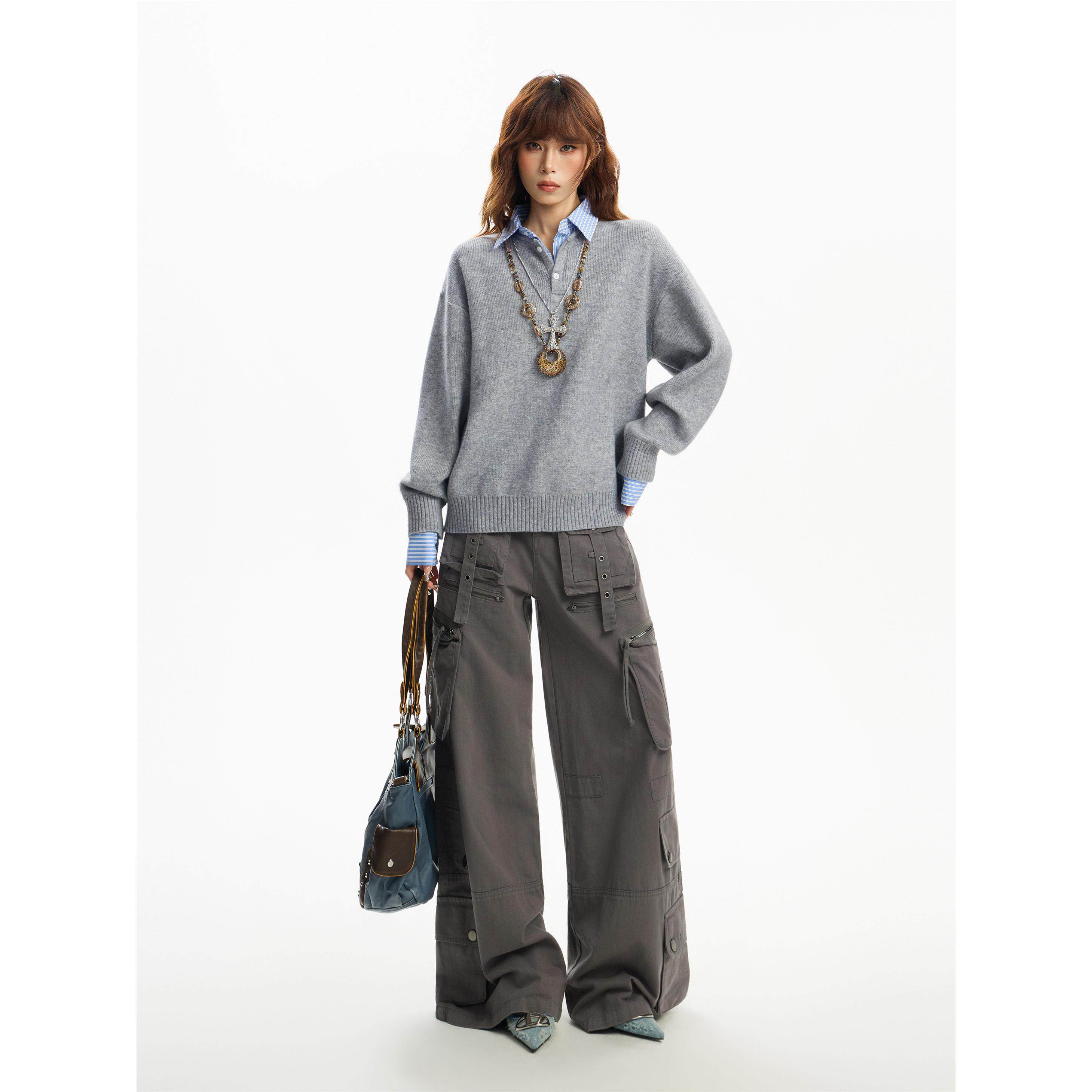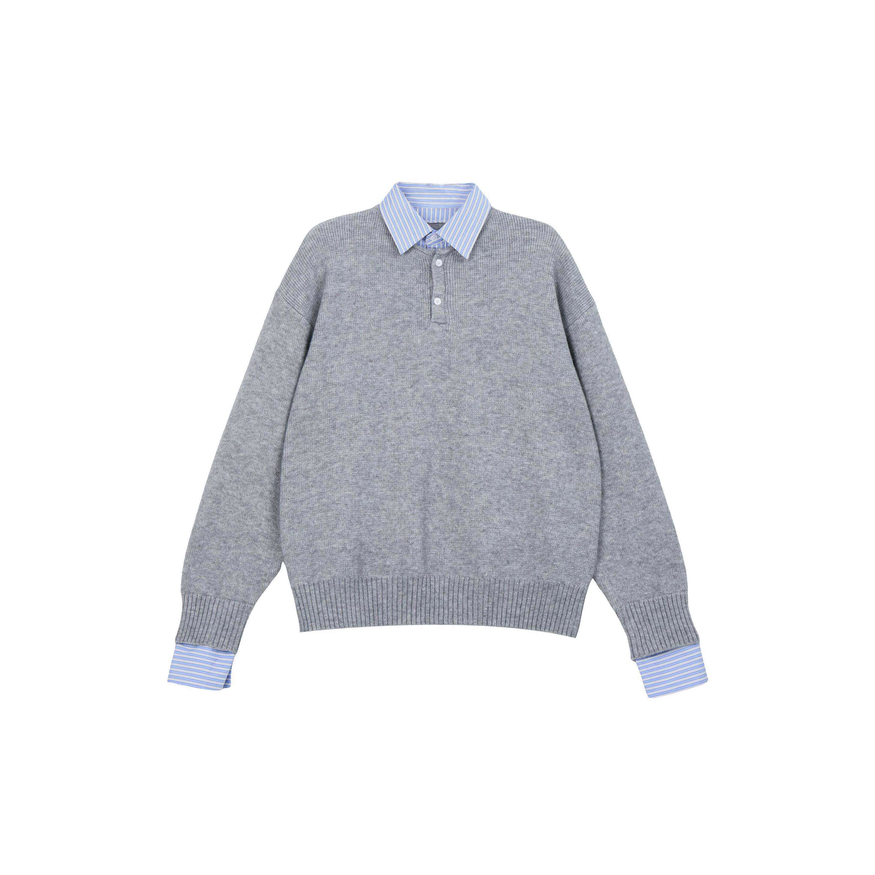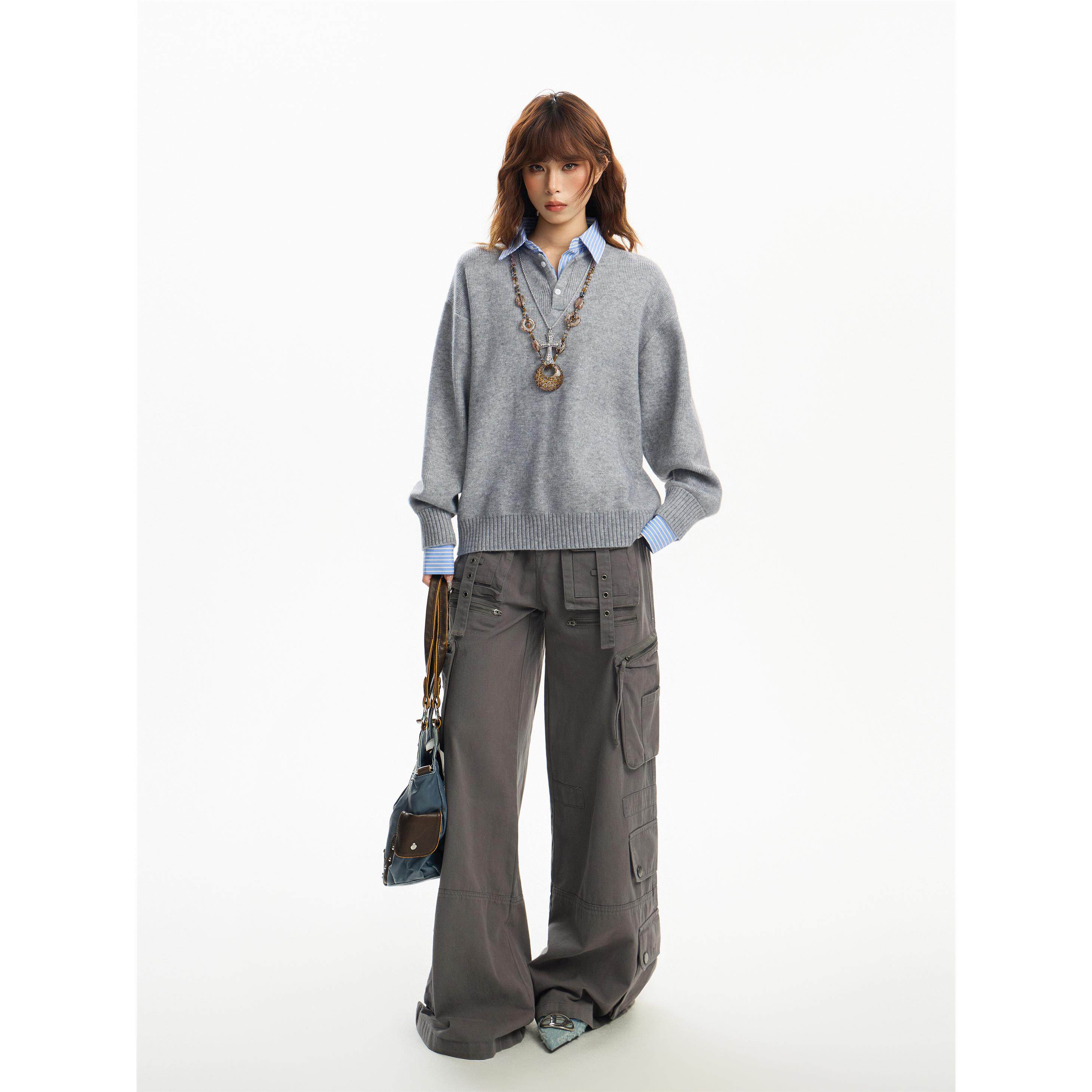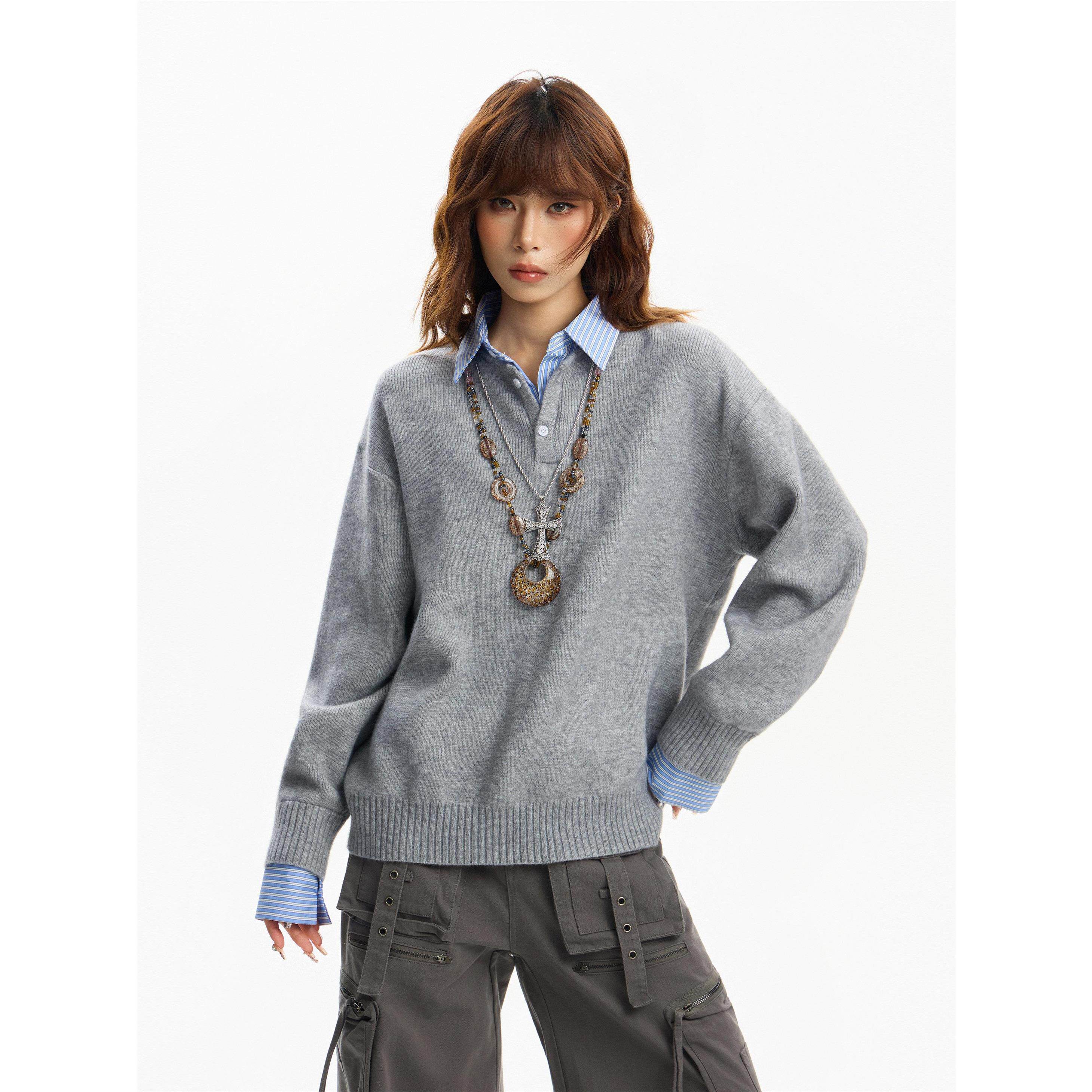 美式灰色正肩格子polo领假两件套头毛衣女秋冬宽松慵懒风针织上衣