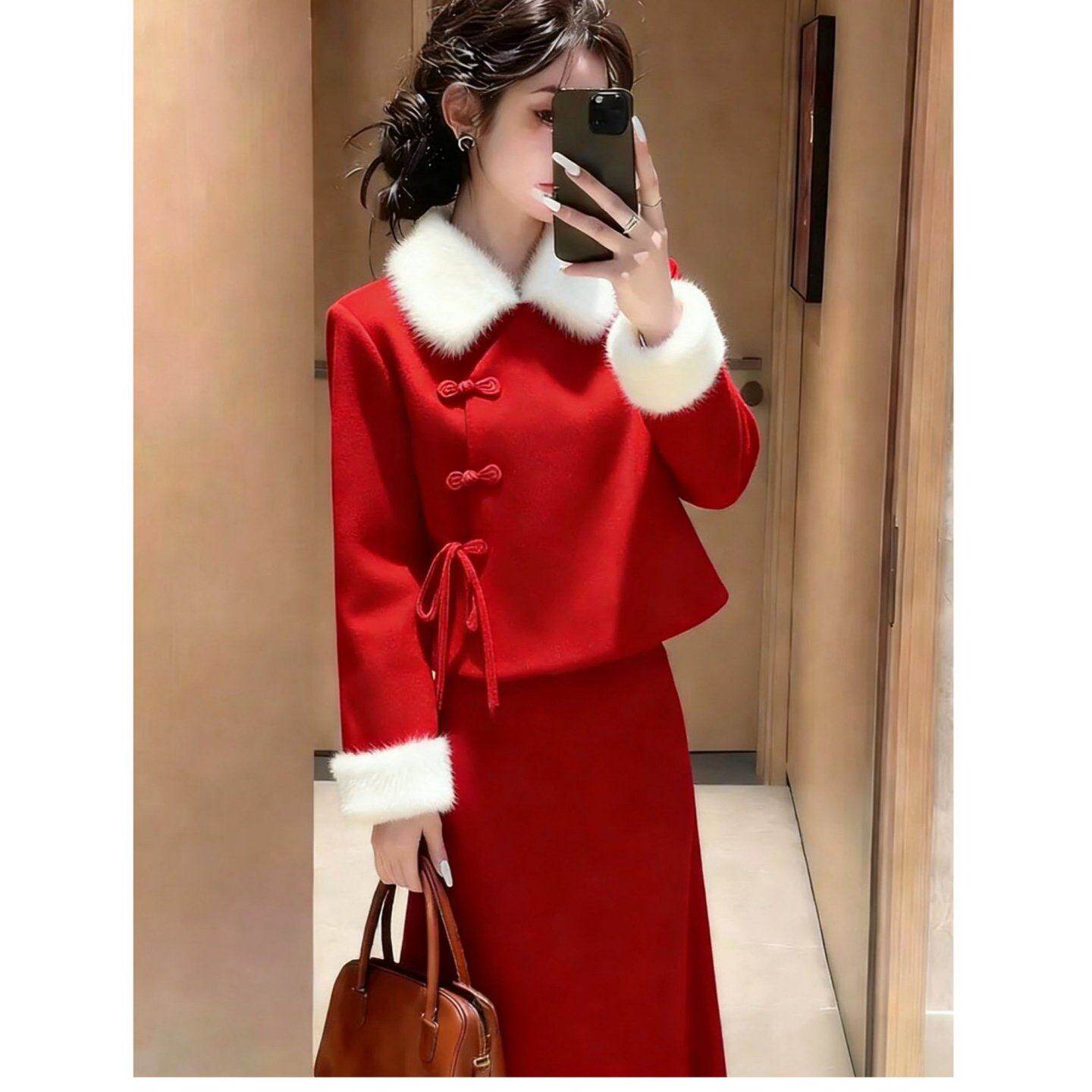 套装女2026新款冬装新中式国风翻领盘扣上衣高腰显瘦直筒半身裙
