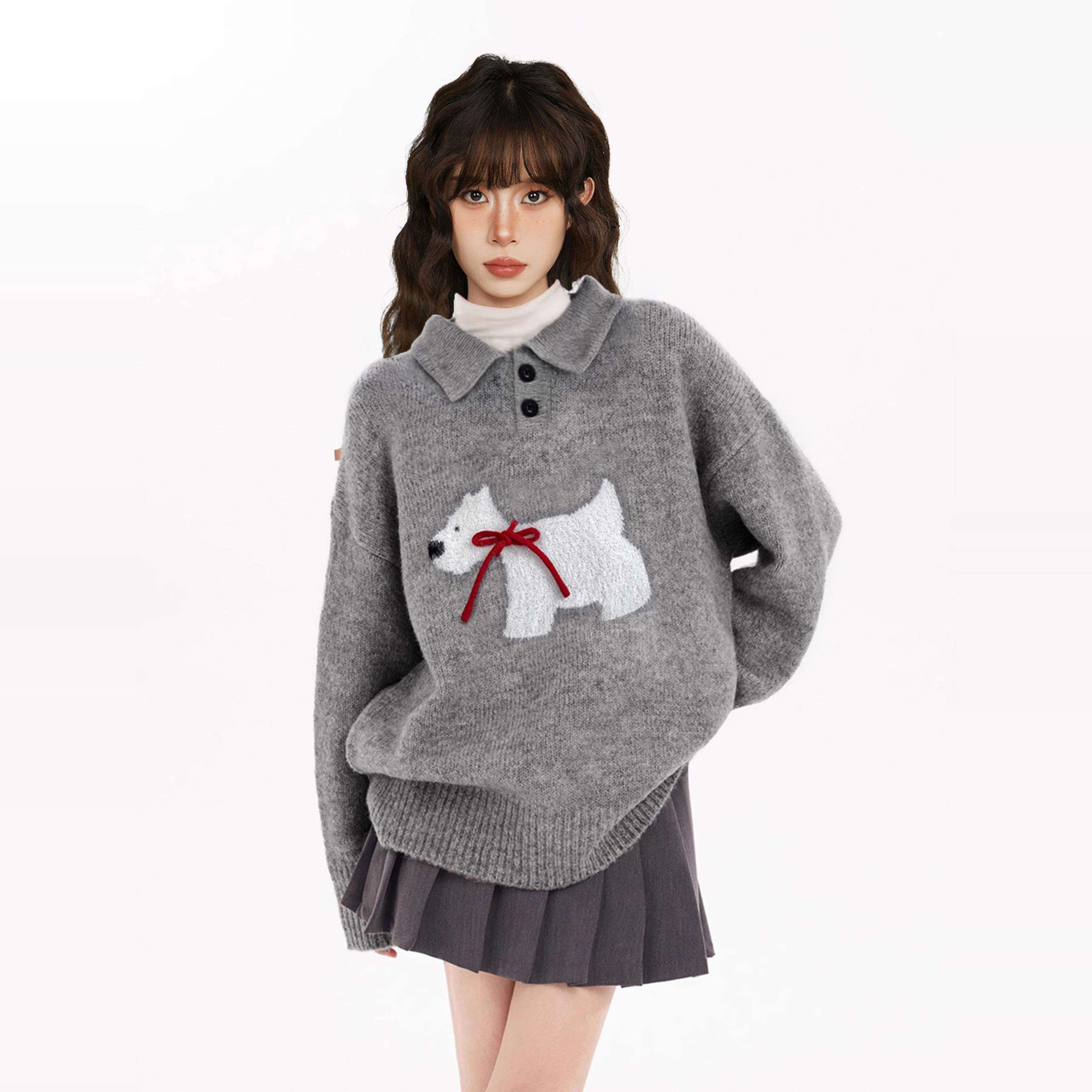 新年红色小狗polo翻领套头毛衣女秋冬冬季高级感针织衫本命年上衣