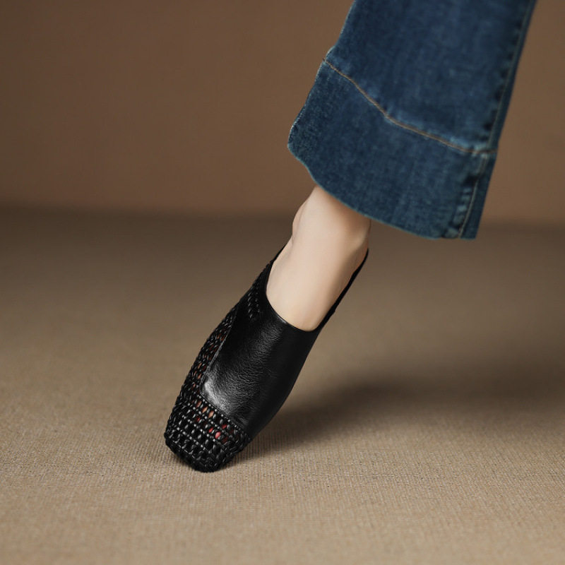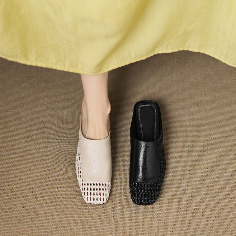 法式镂空编织包头半拖鞋女2025新款夏真皮方头低跟凉拖外穿穆勒鞋