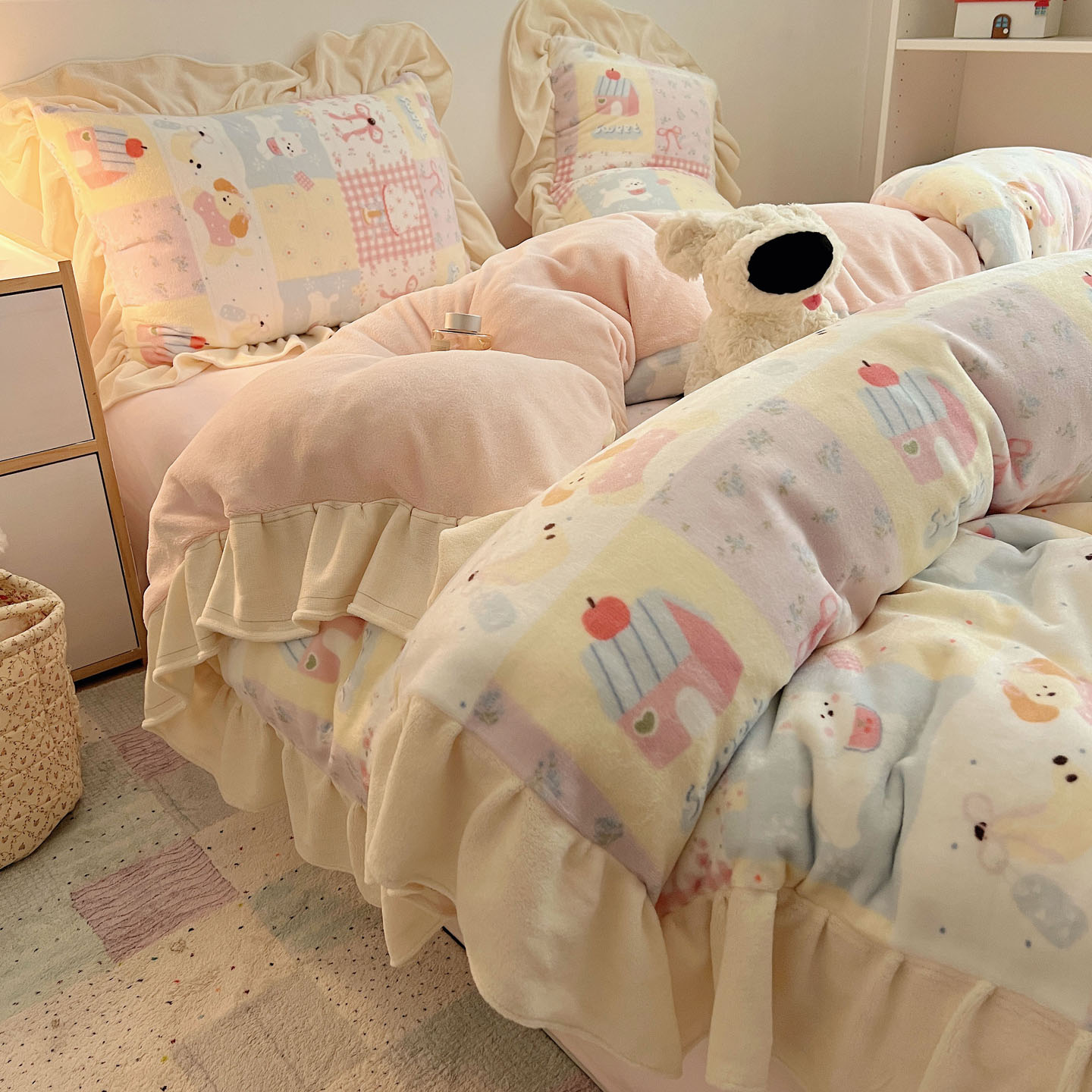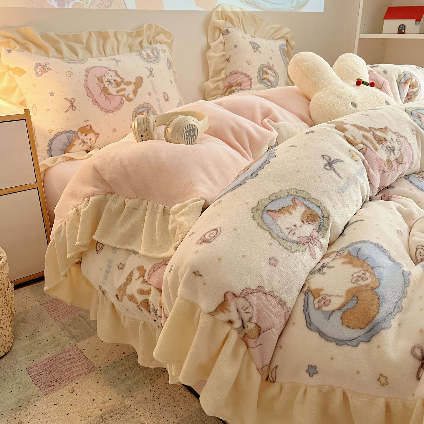 2025新款小清新卡通宿舍三件套家纺床品牛奶绒卡通花边款四件套