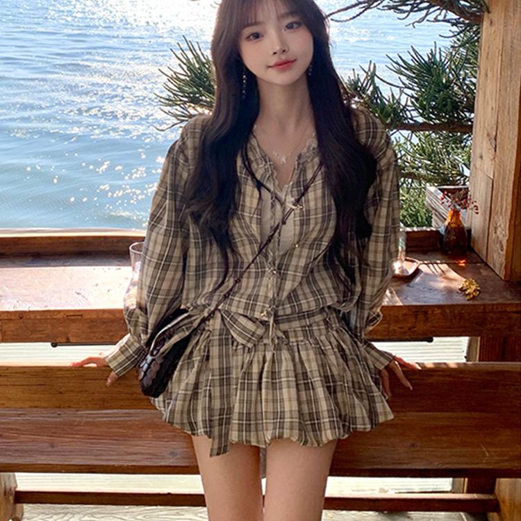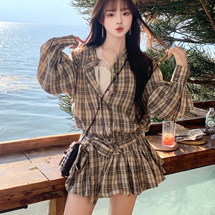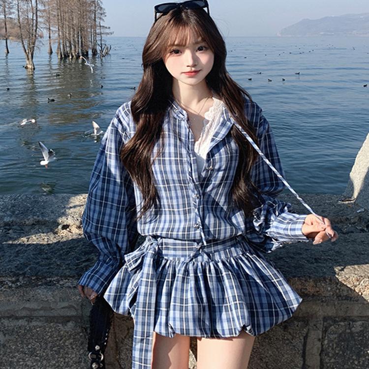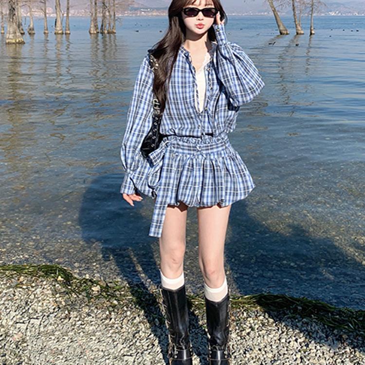 韩系学院风套装女春季2025新款宽松蓝色格纹花苞裙裤+衬衫两件套
