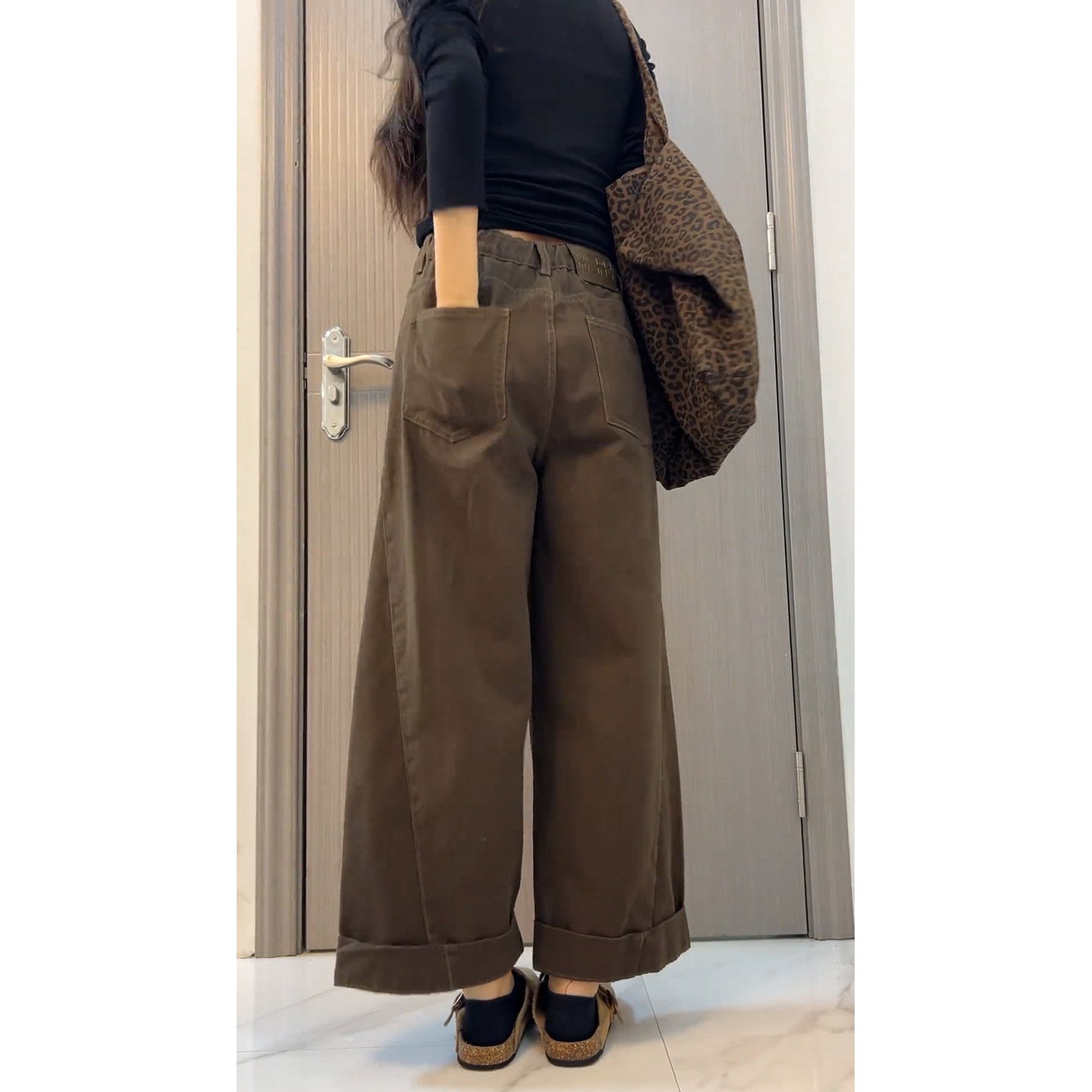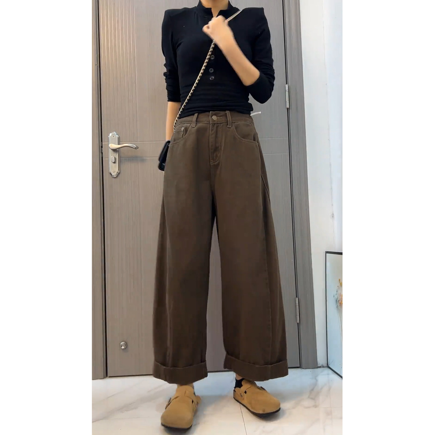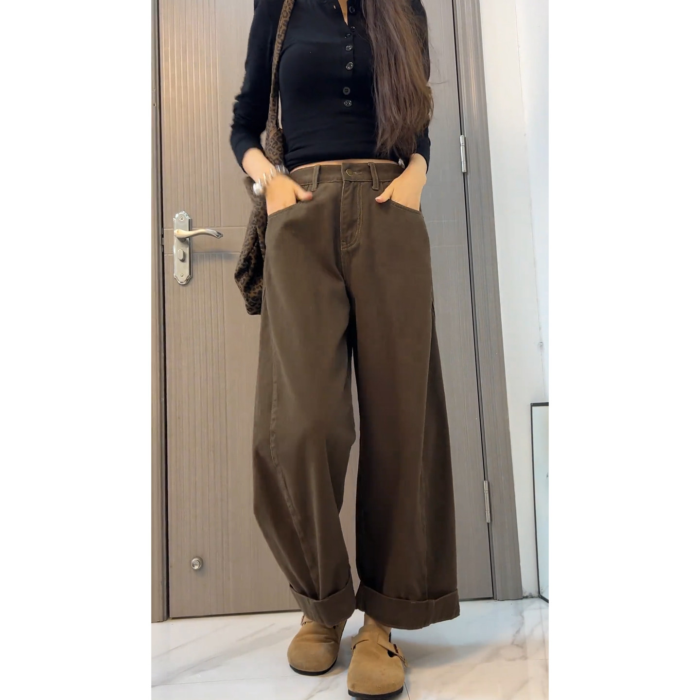 咖色阔腿牛仔裤女加绒加厚裤子梨型身材粗腿宽胯小个子宽松弯刀裤