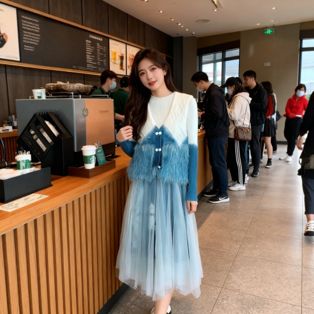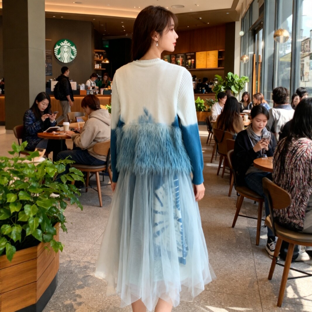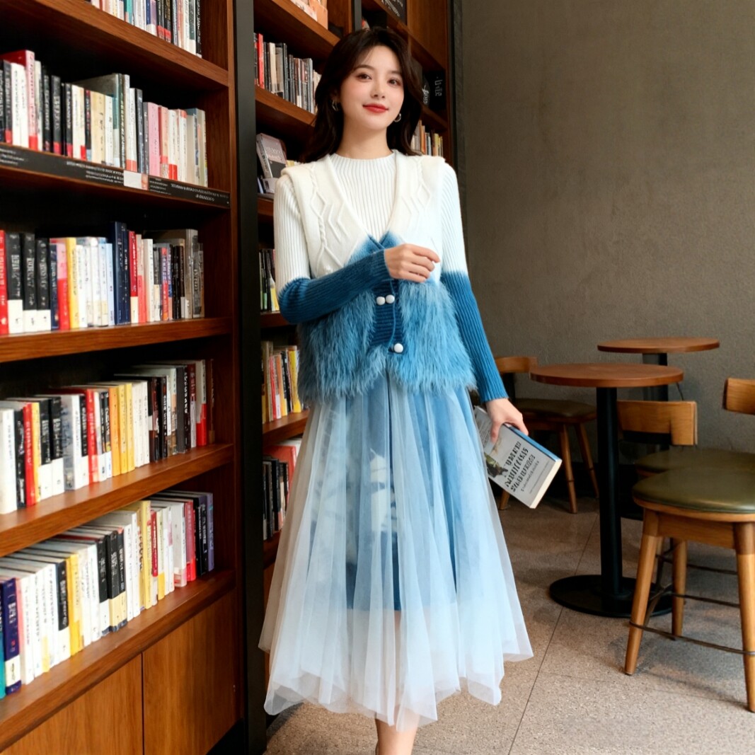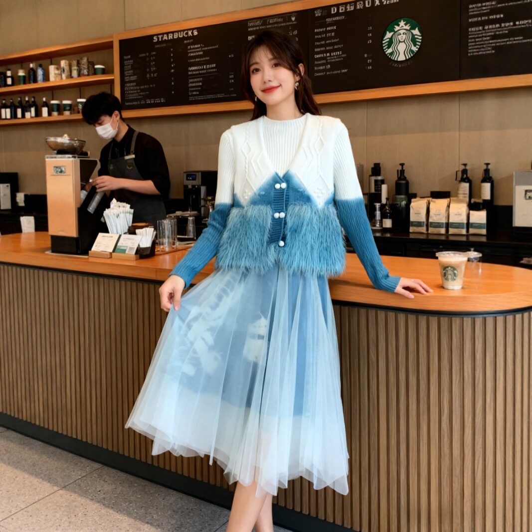 首页> 女装> 扎染秋冬新款针织马甲搭配针织连衣裙两件套网纱裙打底裙毛衣套装