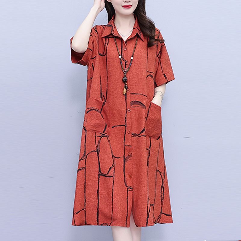 大码夏季开衫新款POLO衬衫连衣裙休闲妈妈中长款宽松印花裙子洋气